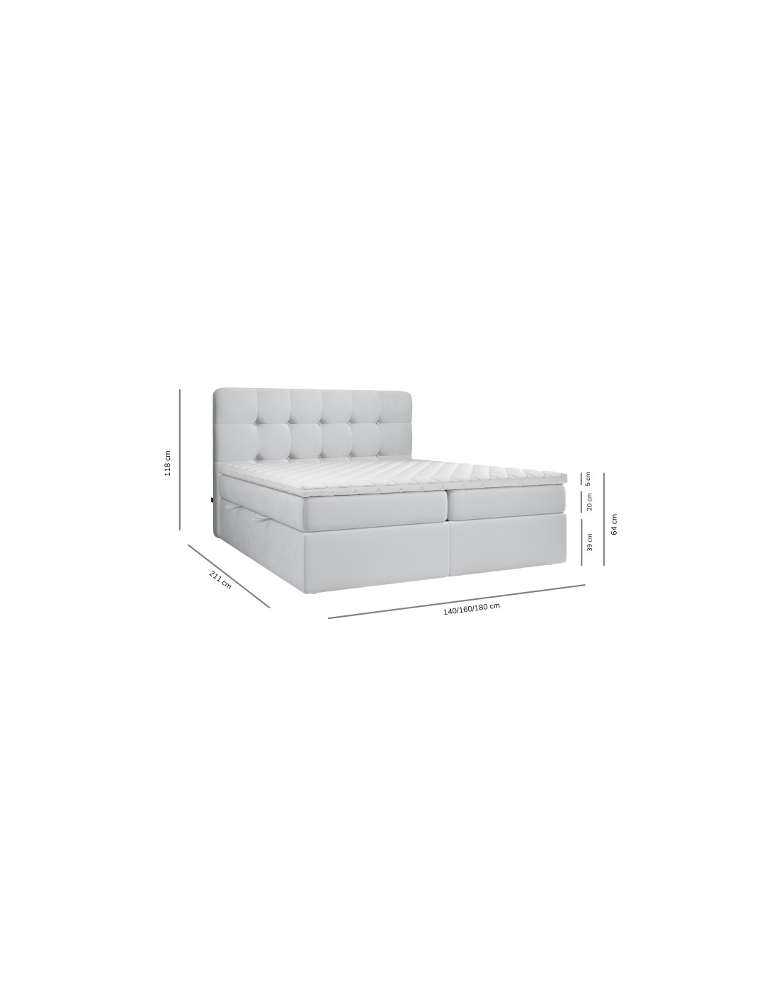 Kontinentalseng med opbevaring og sengegavl, fremstillet i grå polyester. Sengen måler 140 x 200 / 211 cm i bredde og dybde og 64 / 118 cm i højden. Madrasserne er med 7 komfortzoner for optimal komfort.