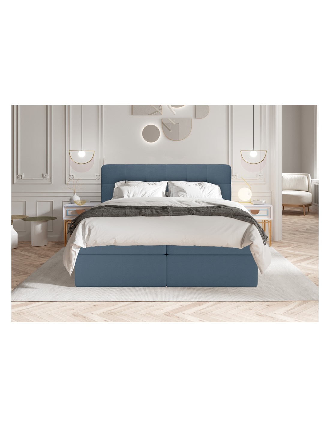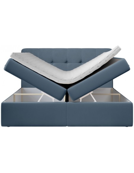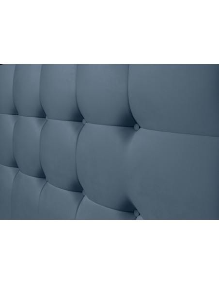 Kontinentalseng med opbevaring og sengegavl, fremstillet i blå velour. Sengen måler 140 x 200 / 211 cm i bredde og dybde og 64 / 118 cm i højden. Madrasserne er med 7 komfortzoner for optimal komfort.