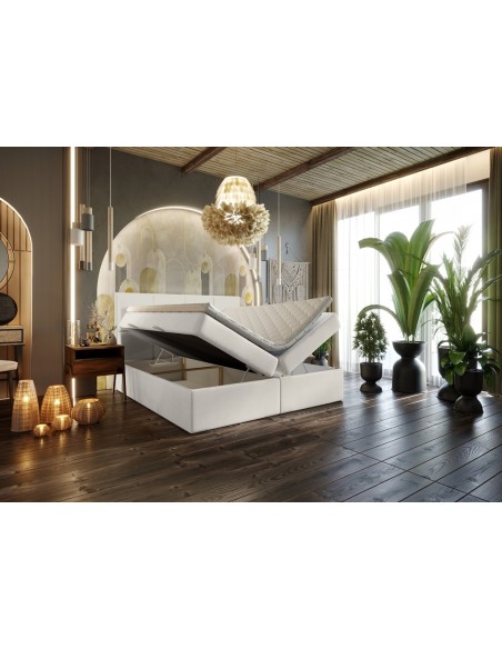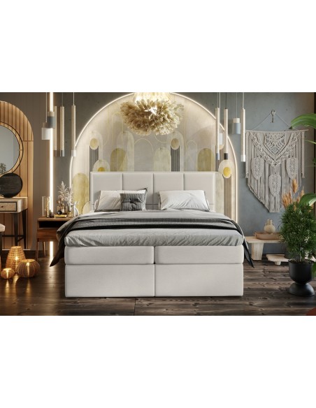 Kontinentalseng med opbevaring og sengegavl, fremstillet i ecru polyester. Sengen måler 140 x 200 / 211 cm i bredde og dybde og 64 / 118 cm i højden. Madrasserne er med 7 komfortzoner for optimal komfort.