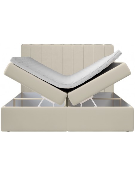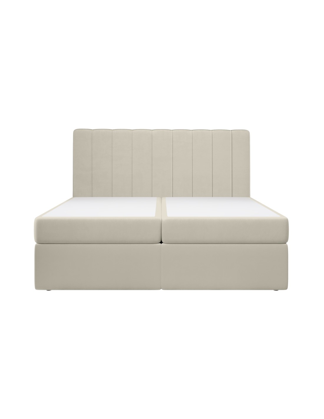 Kontinentalseng med opbevaring og sengegavl, fremstillet i lys beige velour. Sengen måler 140 x 200 / 211 cm i bredde og dybde og 64 / 118 cm i højden. Madrasserne er med 7 komfortzoner for optimal komfort.