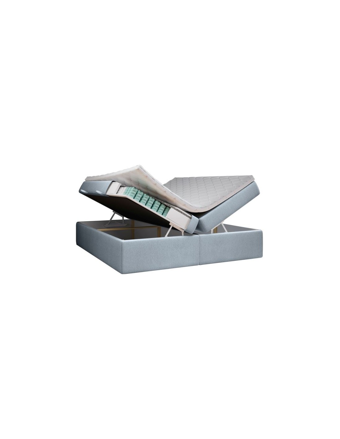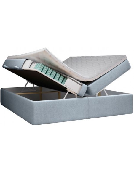 Kontinentalseng med opbevaring og sengegavl, fremstillet i blågrå polyester. Sengen måler 140 x 200 / 211 cm i bredde og dybde og 64 / 118 cm i højden. Madrasserne er med 7 komfortzoner for optimal komfort.