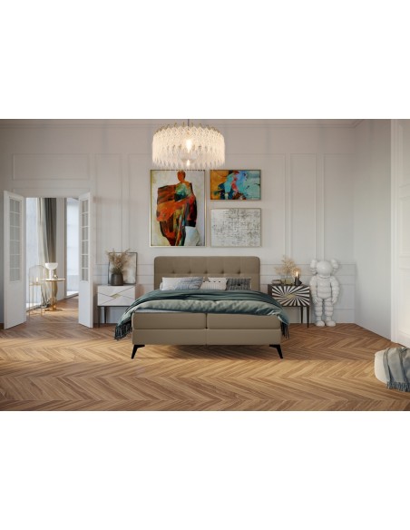 Kontinentalseng med opbevaring og sengegavl, fremstillet i guldbeige velour. Sengen måler 140 x 200 / 211 cm i bredde og dybde og 55 / 118 cm i højden. Madrasserne er med 7 komfortzoner for optimal komfort.