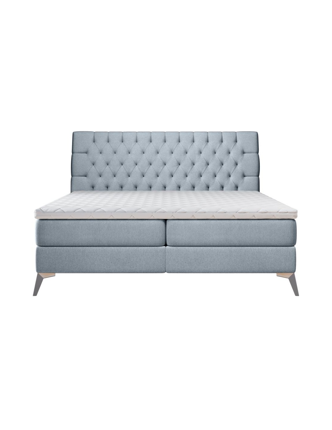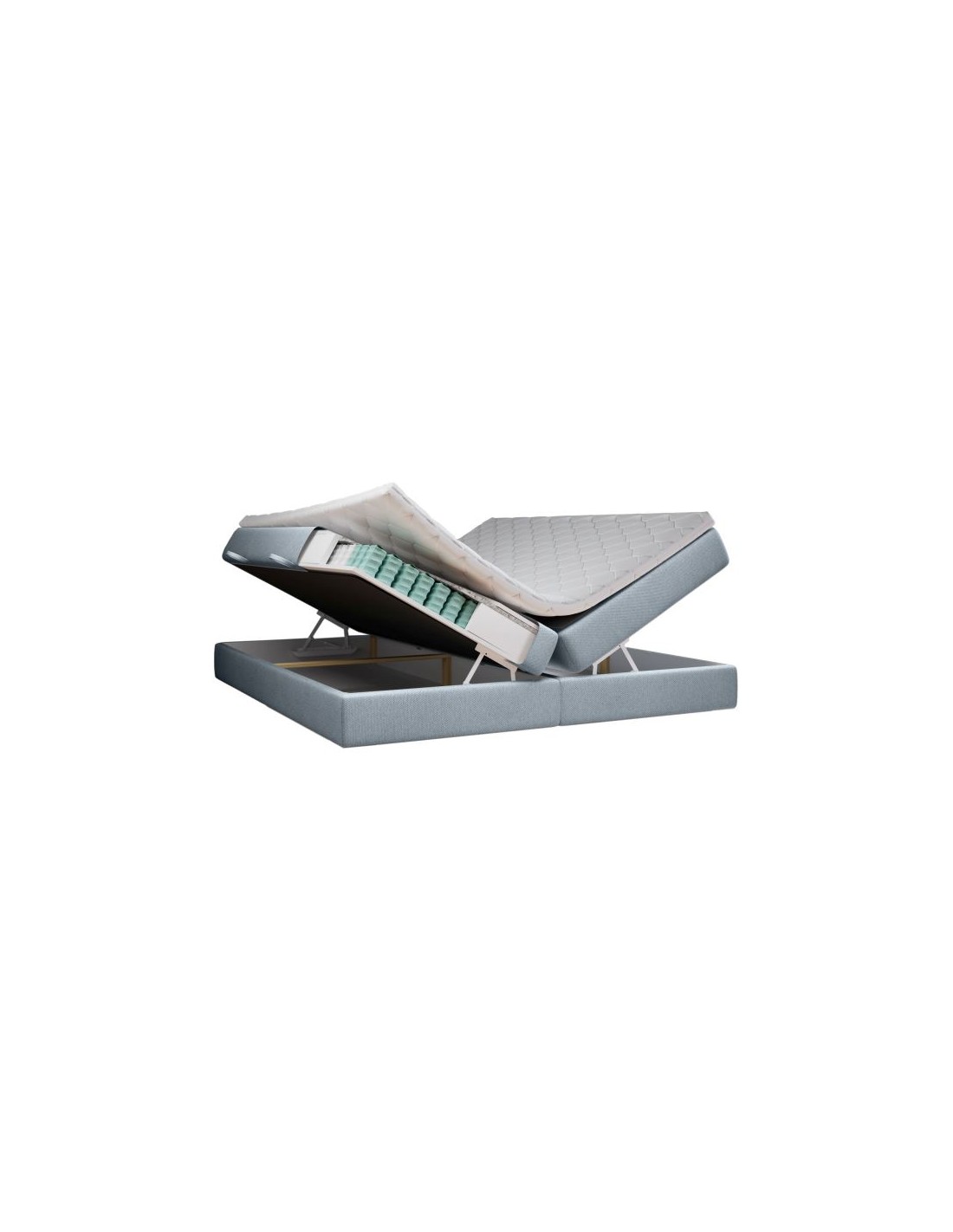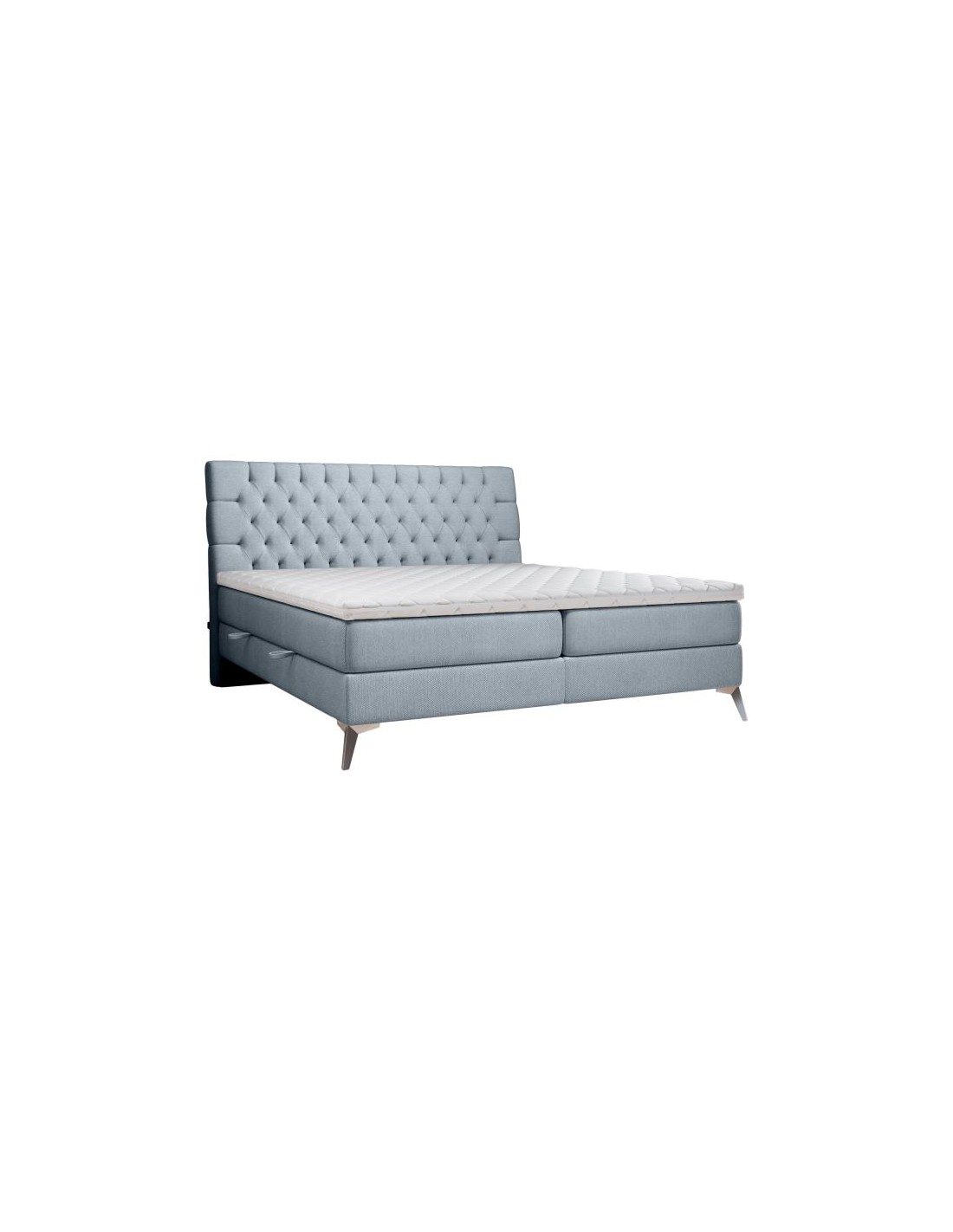 Kontinentalseng med opbevaring og sengegavl, fremstillet i blågrå polyester. Sengen måler 140 x 200 / 211 cm i bredde og dybde og 55 / 118 cm i højden. Madrasserne er med 7 komfortzoner for optimal komfort.