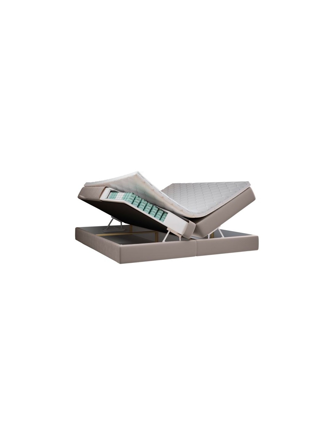 Kontinentalseng med opbevaring og sengegavl, fremstillet i mørk beige velour. Sengen måler 140 x 200 / 211 cm i bredde og dybde og 55 / 120 cm i højden. Madrasserne er med 7 komfortzoner for optimal komfort.