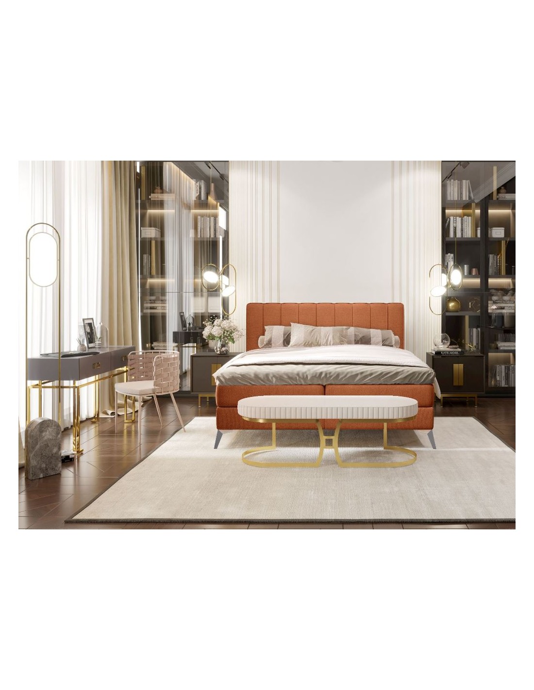 Kontinentalseng med opbevaring og sengegavl, fremstillet i kobberfarvet polyester. Sengen måler 140 x 200 / 211 cm i bredde og dybde og 55 / 120 cm i højden. Madrasserne er med 7 komfortzoner for optimal komfort.