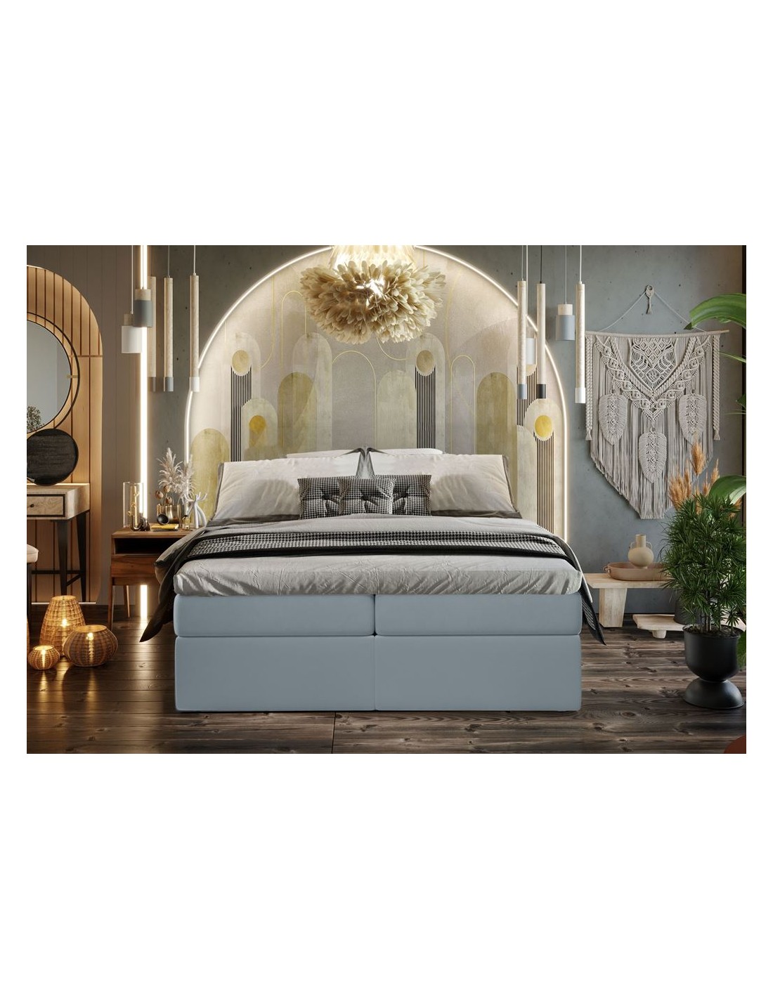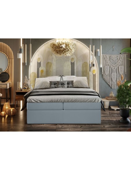 Kontinentalseng med opbevaring, fremstillet i blågrå velour. Sengen måler 140 x 200 cm i bredde og dybde og 64 cm i højden. Madrasserne er med 7 komfortzoner for optimal komfort.