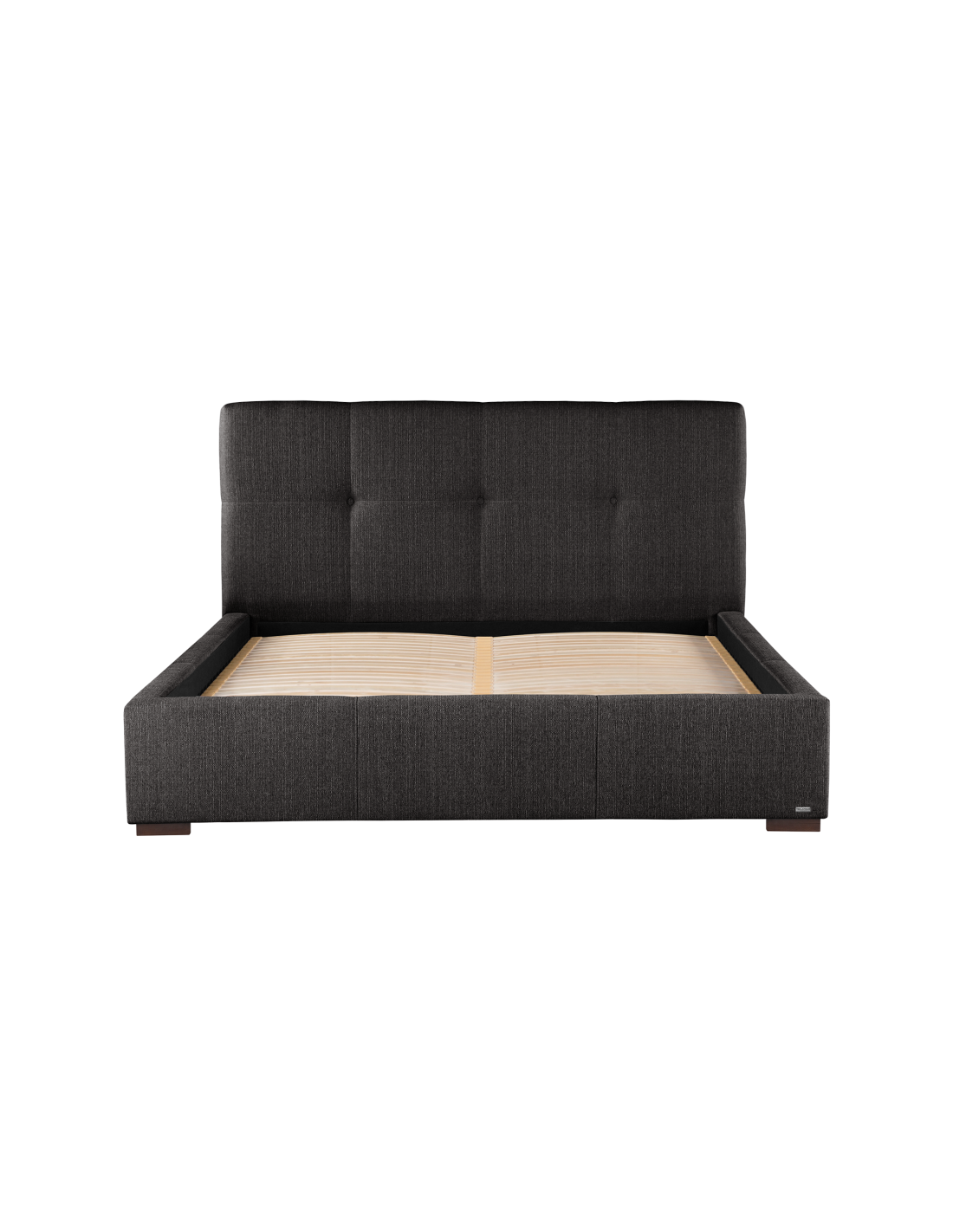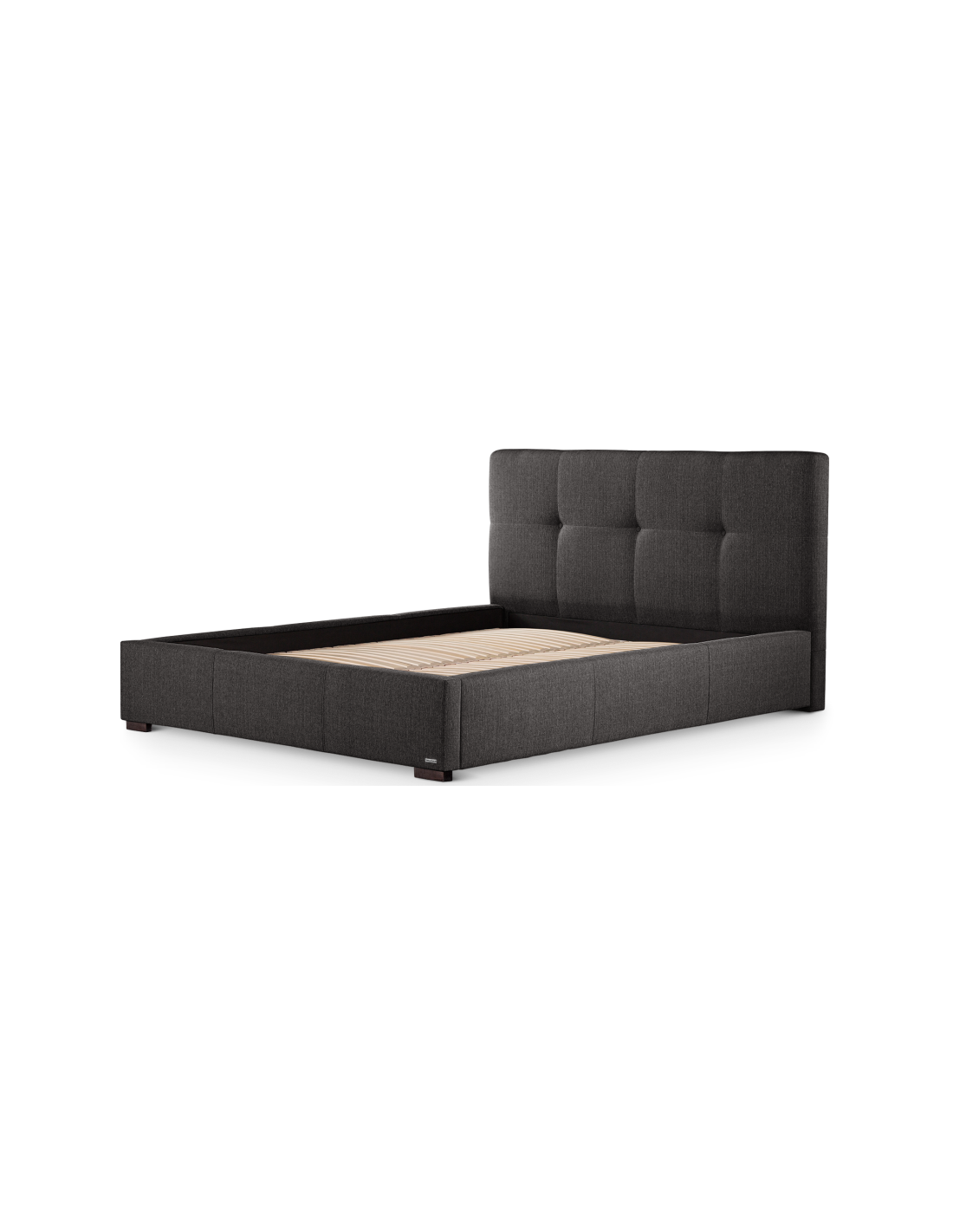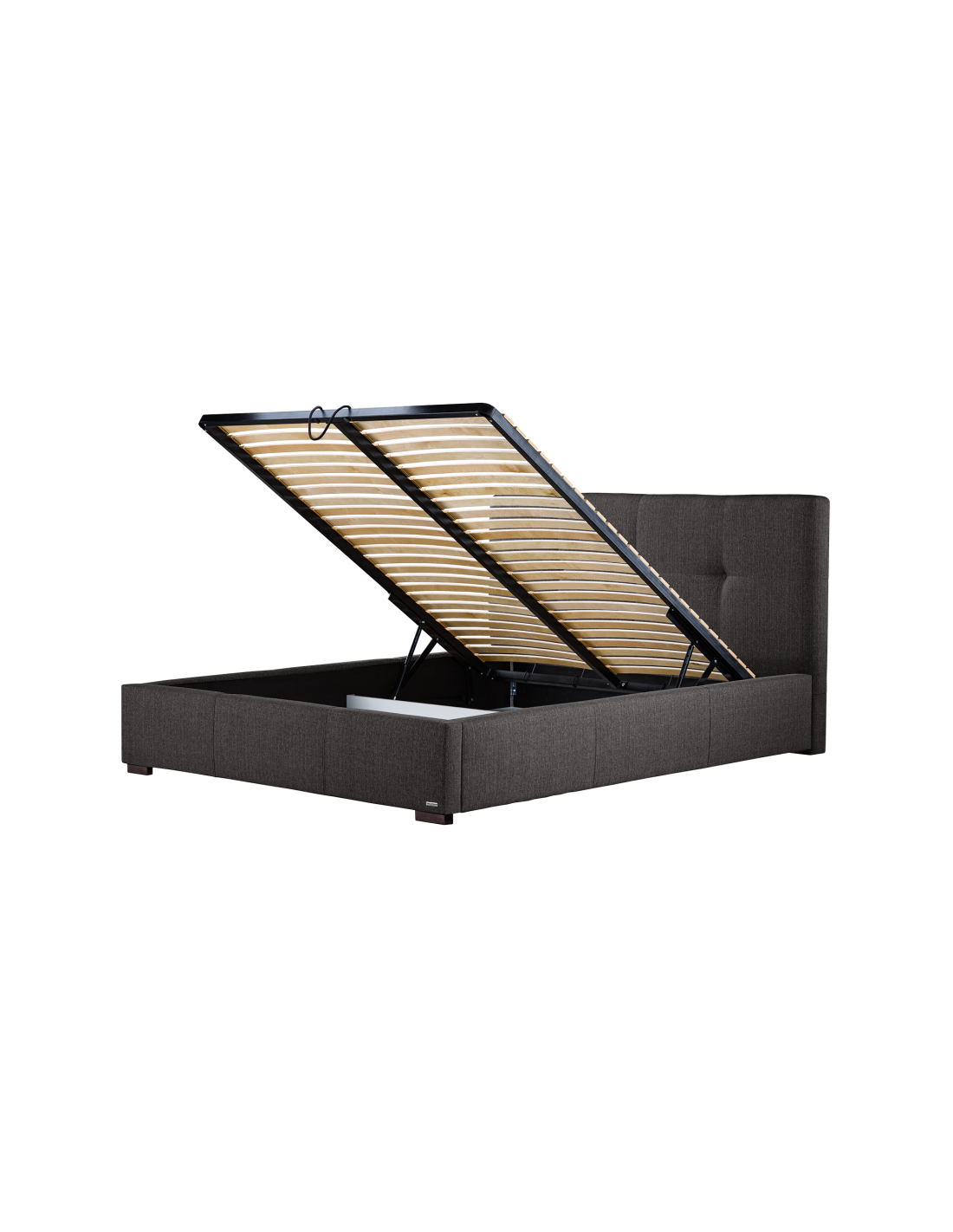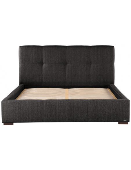 Sengeramme med sengegavl og opbevaring, fremstillet i mørkegrå polyester. Sengen måler 178 x 223 cm i bredde og dybde og 34 / 106 cm i højden. Til sengen passer en madras med målene 160 x 200 cm, eller 2 stk. 80 x 200 cm. Denne model har opbevaring under lamelbund.