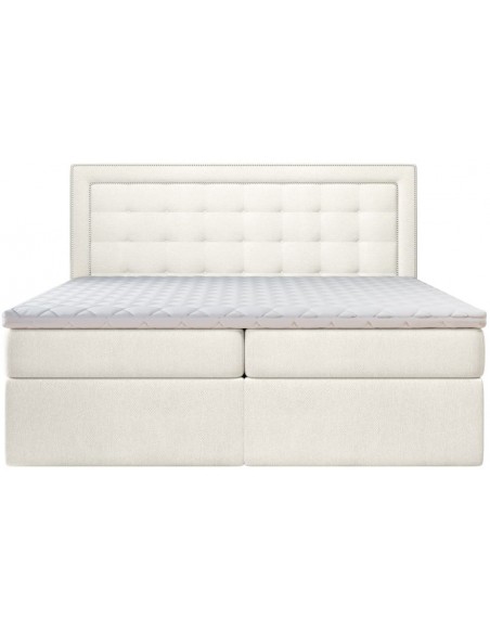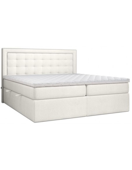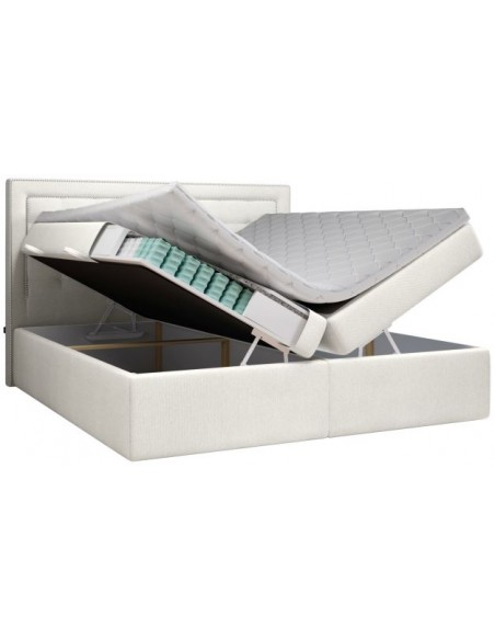 Kontinentalseng med opbevaring og sengegavl, fremstillet i ecrufarvet polyester og med sølvfarvede nitter rundt på sengegavlen. Sengen måler 160 x 200 / 211 cm i bredde og dybde og 64 / 120 cm i højden. Madrasserne er med 7 komfortzoner for optimal komfort.