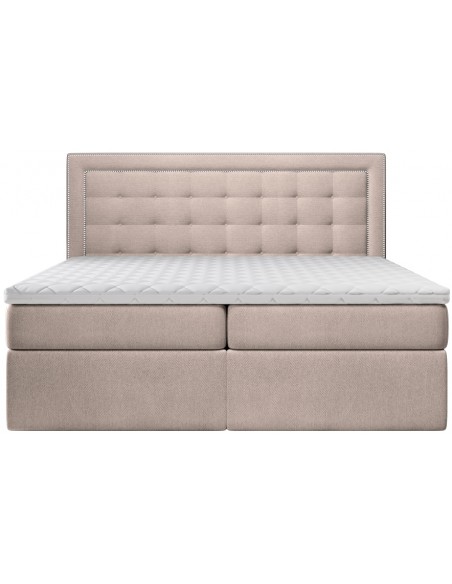 Kontinentalseng med opbevaring og sengegavl, fremstillet i beige polyester og med sølvfarvede nitter rundt på sengegavlen. Sengen måler 160 x 200 / 211 cm i bredde og dybde og 64 / 120 cm i højden. Madrasserne er med 7 komfortzoner for optimal komfort.