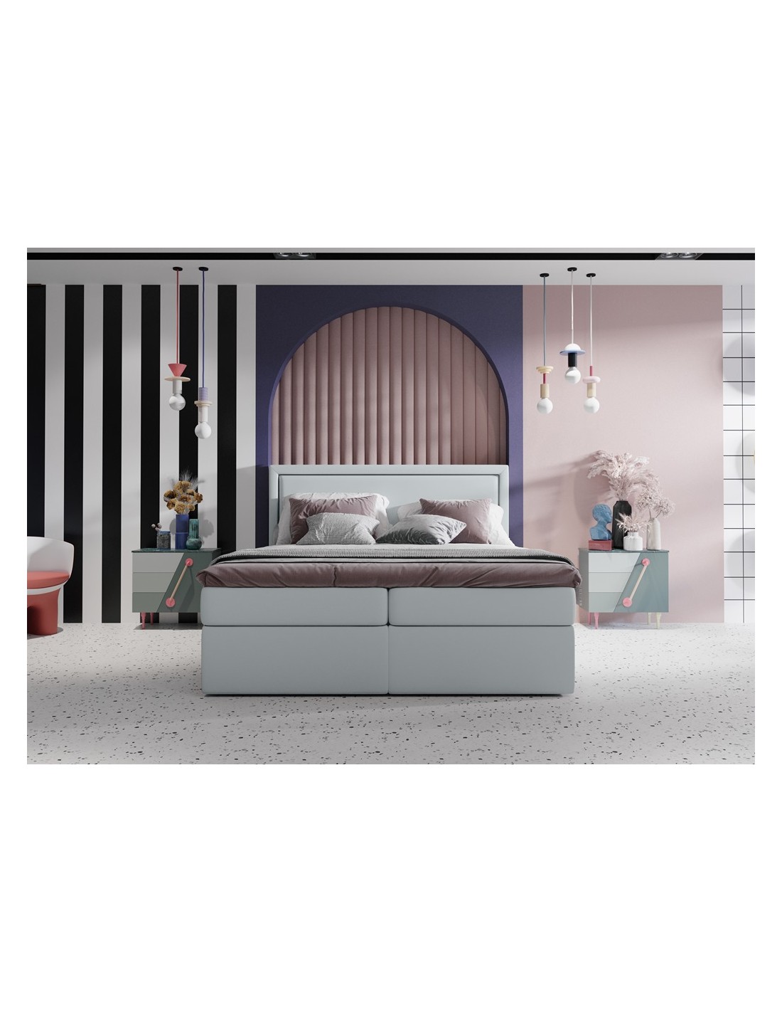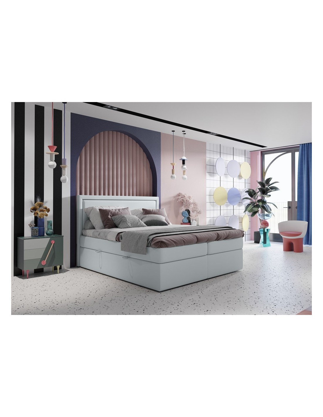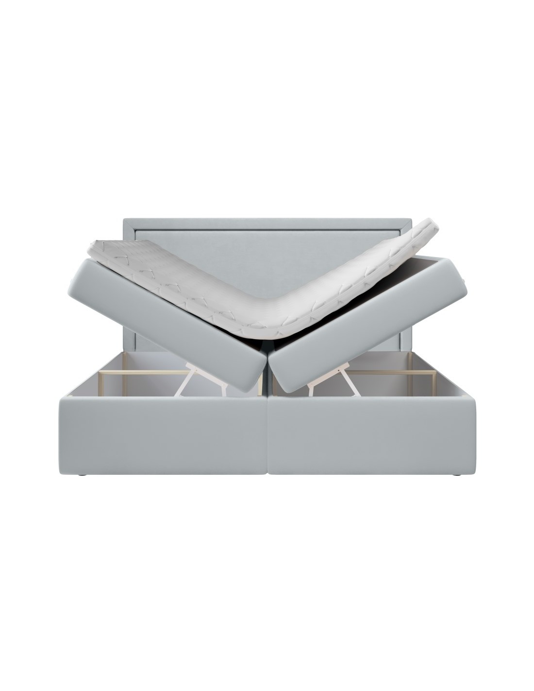 Kontinentalseng med opbevaring og sengegavl, fremstillet i lysegrå velour. Sengen måler 160 x 200 / 211 cm i bredde og dybde og 64 / 118 cm i højden. Madrasserne er med 7 komfortzoner for optimal komfort.