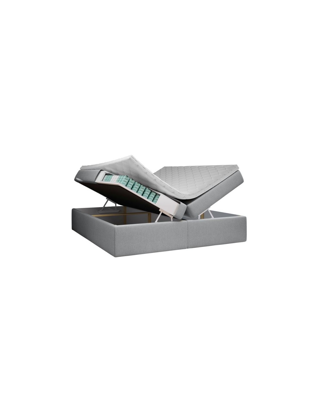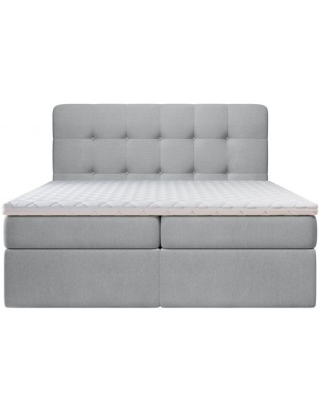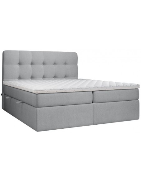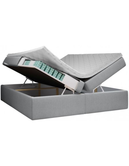 Kontinentalseng med opbevaring og sengegavl, fremstillet i grå polyester. Sengen måler 160 x 200 / 211 cm i bredde og dybde og 64 / 118 cm i højden. Madrasserne er med 7 komfortzoner for optimal komfort.