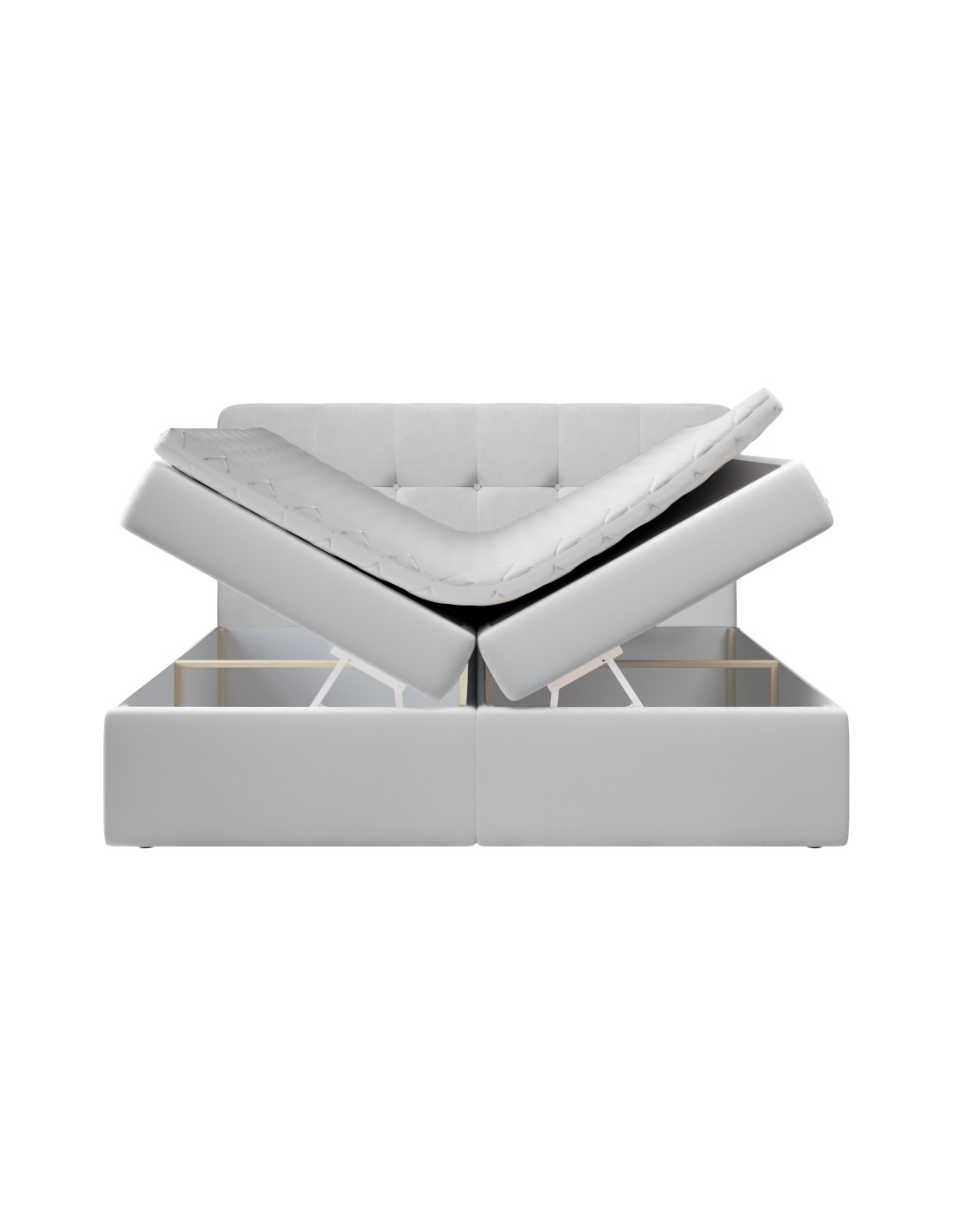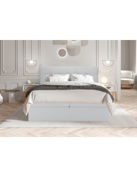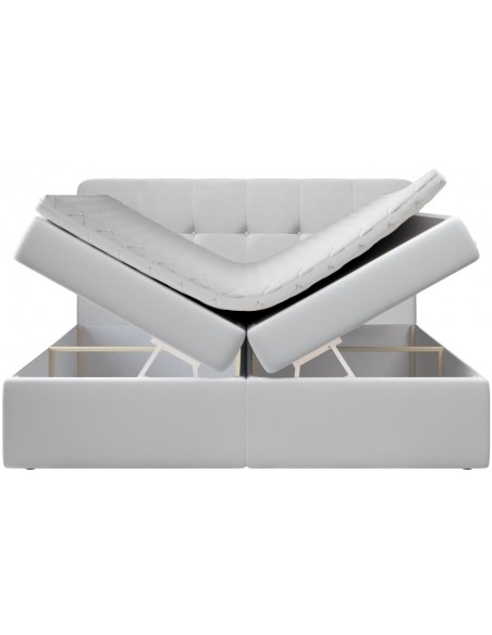 Kontinentalseng med opbevaring og sengegavl, fremstillet i lysegrå velour. Sengen måler 160 x 200 / 211 cm i bredde og dybde og 64 / 118 cm i højden. Madrasserne er med 7 komfortzoner for optimal komfort.