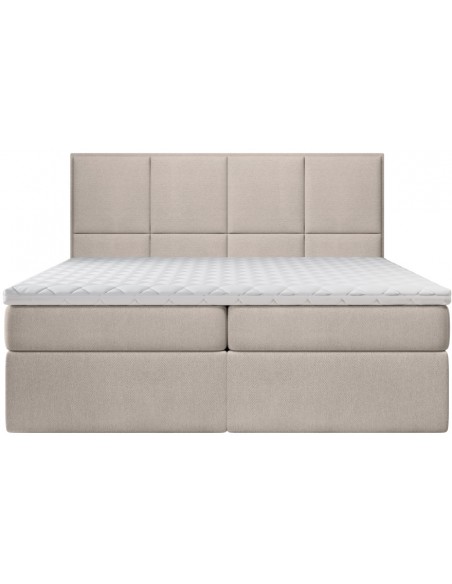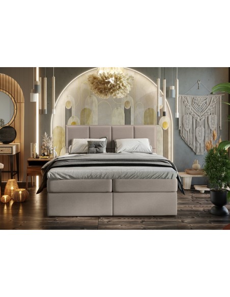 Kontinentalseng med opbevaring og sengegavl, fremstillet i mørk beige polyester. Sengen måler 160 x 200 / 211 cm i bredde og dybde og 64 / 118 cm i højden. Madrasserne er med 7 komfortzoner for optimal komfort.