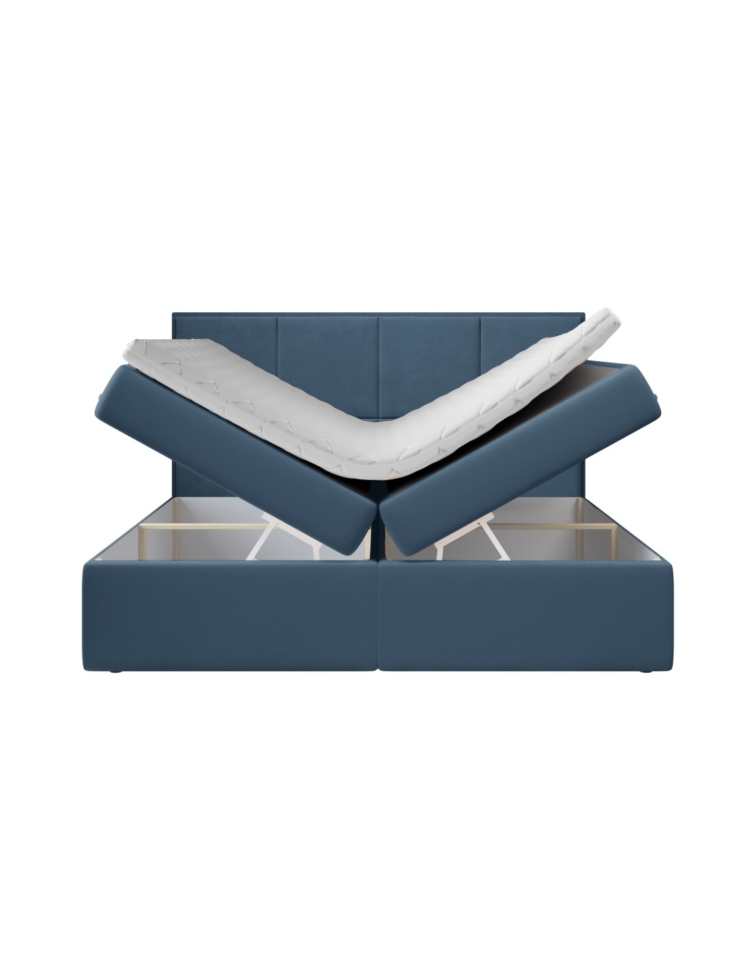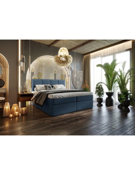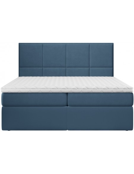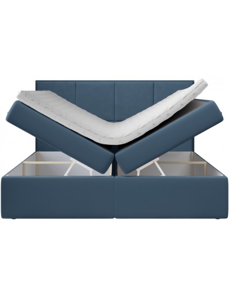 Kontinentalseng med opbevaring og sengegavl, fremstillet i blå velour. Sengen måler 160 x 200 / 211 cm i bredde og dybde og 64 / 118 cm i højden. Madrasserne er med 7 komfortzoner for optimal komfort.