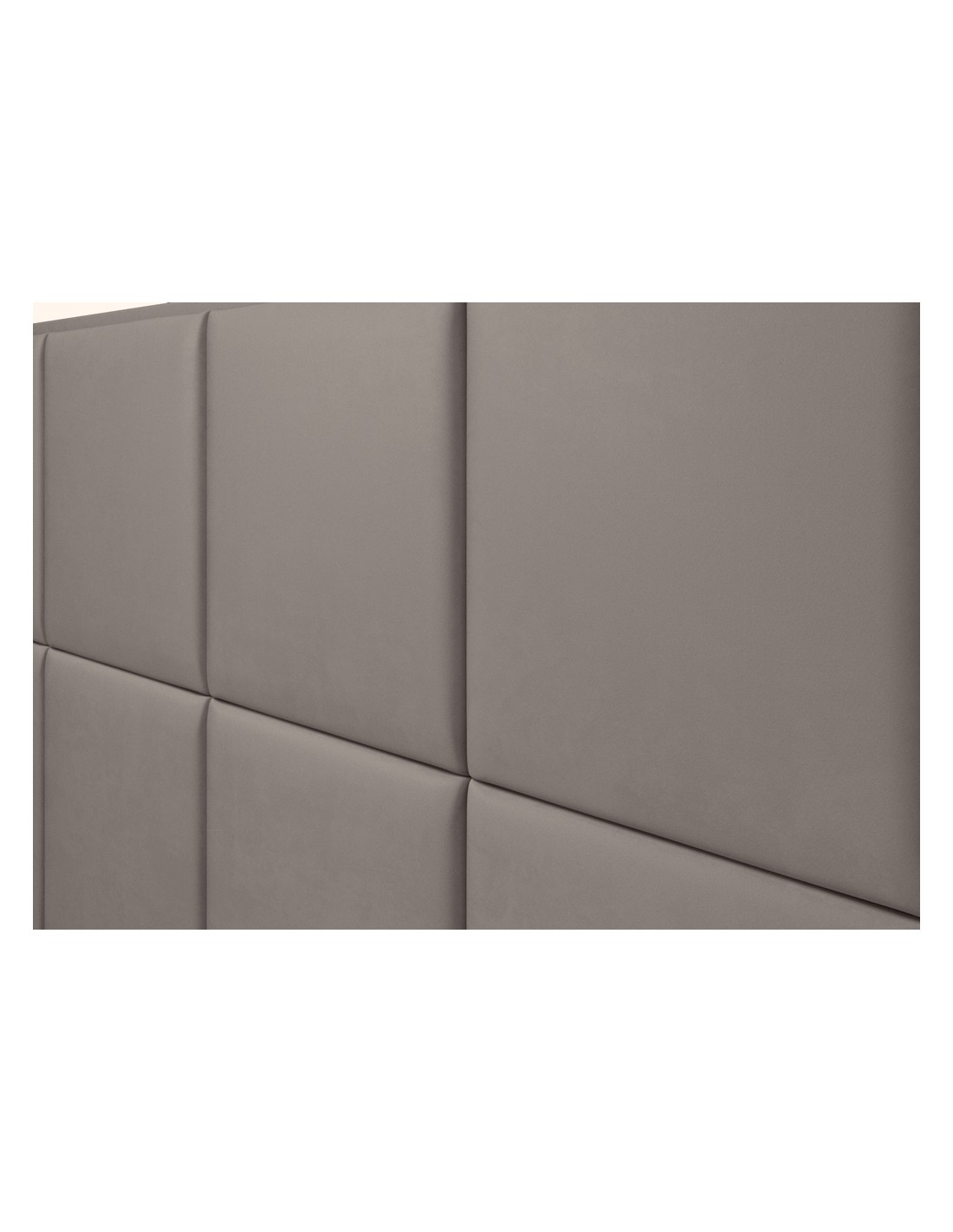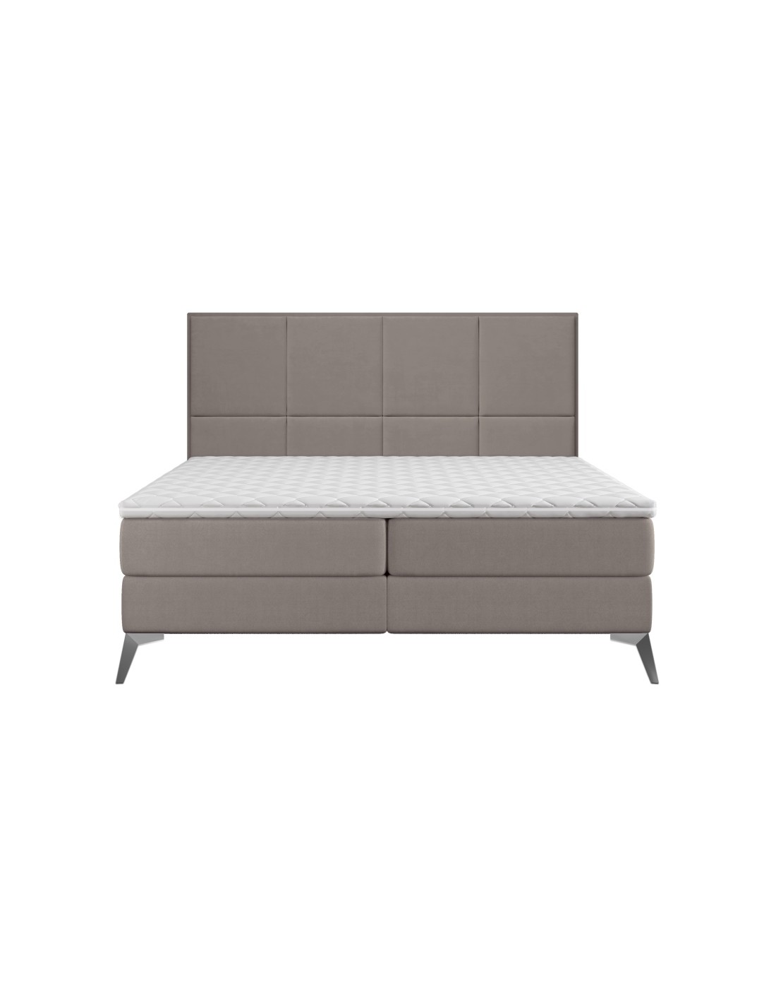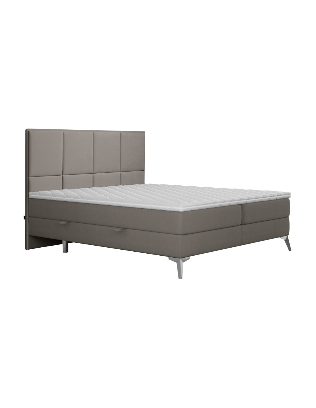 Kontinentalseng med opbevaring og sengegavl, fremstillet i mørk beige velour. Sengen måler 160 x 200 / 211 cm i bredde og dybde og 55 / 123 cm i højden. Madrasserne er med 7 komfortzoner for optimal komfort.