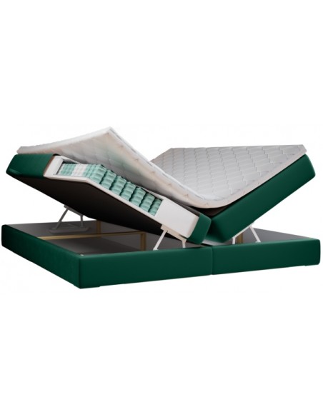 Kontinentalseng med opbevaring og sengegavl, fremstillet i flaskegrøn velour. Sengen måler 160 x 200 / 211 cm i bredde og dybde og 55 / 123 cm i højden. Madrasserne er med 7 komfortzoner for optimal komfort.