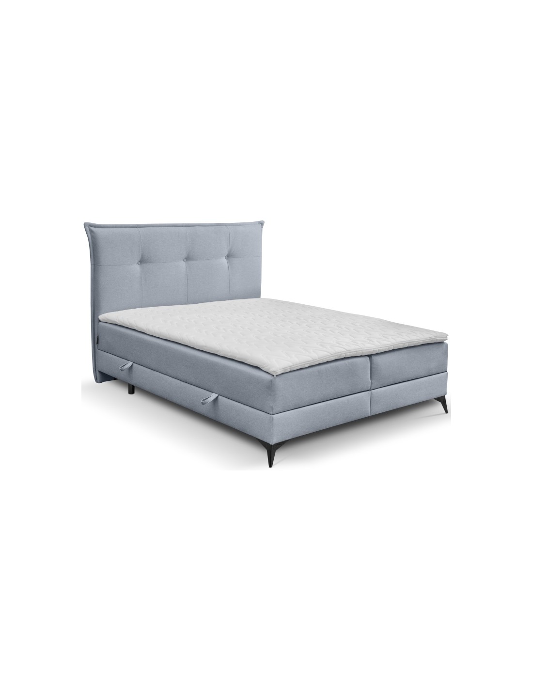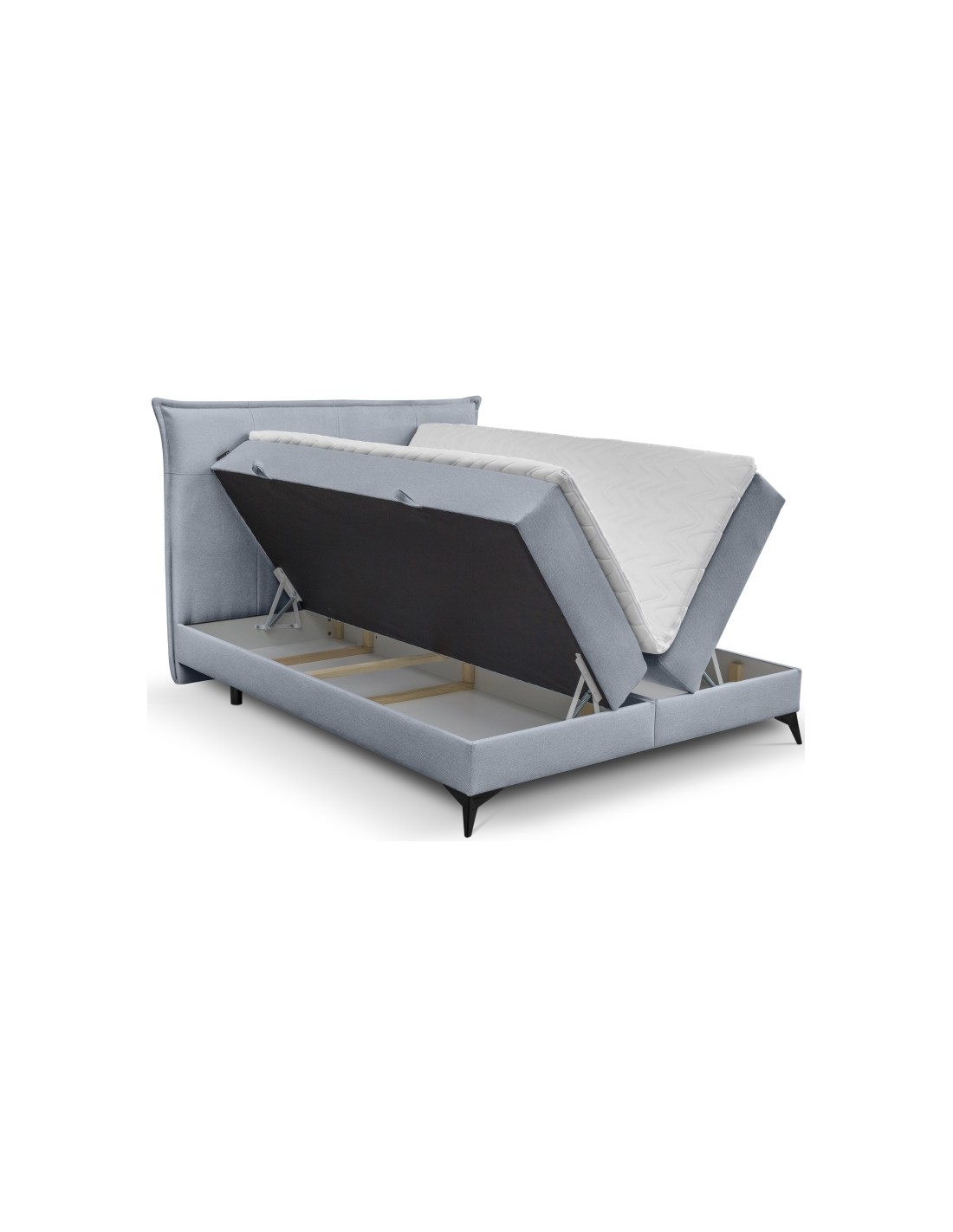 Kontinentalseng med opbevaring og sengegavl, fremstillet i blågrå polyester. Sengen måler 160 x 200 / 211 cm i bredde og dybde og 55 / 118 cm i højden. Madrasserne er med 7 komfortzoner for optimal komfort.
