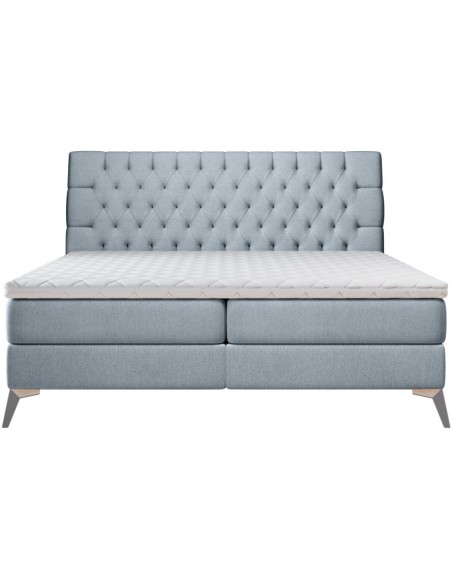 Kontinentalseng med opbevaring og sengegavl, fremstillet i blågrå polyester. Sengen måler 160 x 200 / 211 cm i bredde og dybde og 55 / 118 cm i højden. Madrasserne er med 7 komfortzoner for optimal komfort.