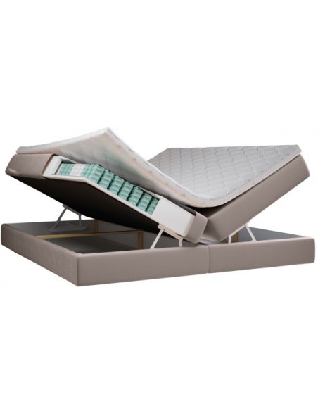 Kontinentalseng med opbevaring og sengegavl, fremstillet i mørk beige velour. Sengen måler 160 x 200 / 211 cm i bredde og dybde og 55 / 120 cm i højden. Madrasserne er med 7 komfortzoner for optimal komfort.