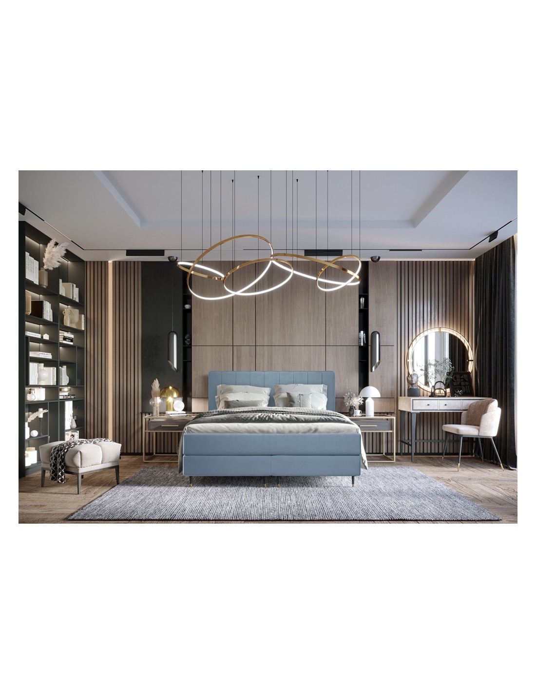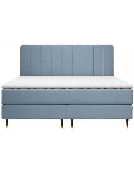 Kontinentalseng med sengegavl, fremstillet i blågrå velour. Sengen måler 160 x 200 / 211 cm i bredde og dybde og 55 / 120 cm i højden. Madrasserne er med 7 komfortzoner for optimal komfort.