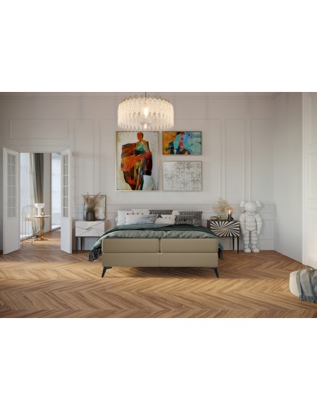Kontinentalseng med opbevaring, fremstillet i guldbeige velour. Sengen måler 160 x 200 cm i bredde og dybde og 55 cm i højden. Madrasserne er med 7 komfortzoner for optimal komfort.