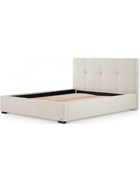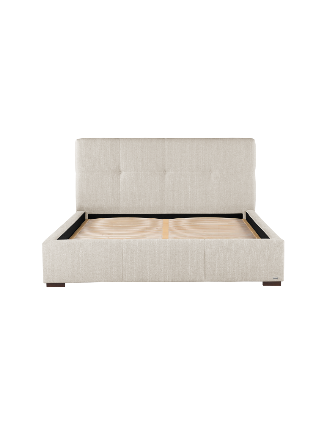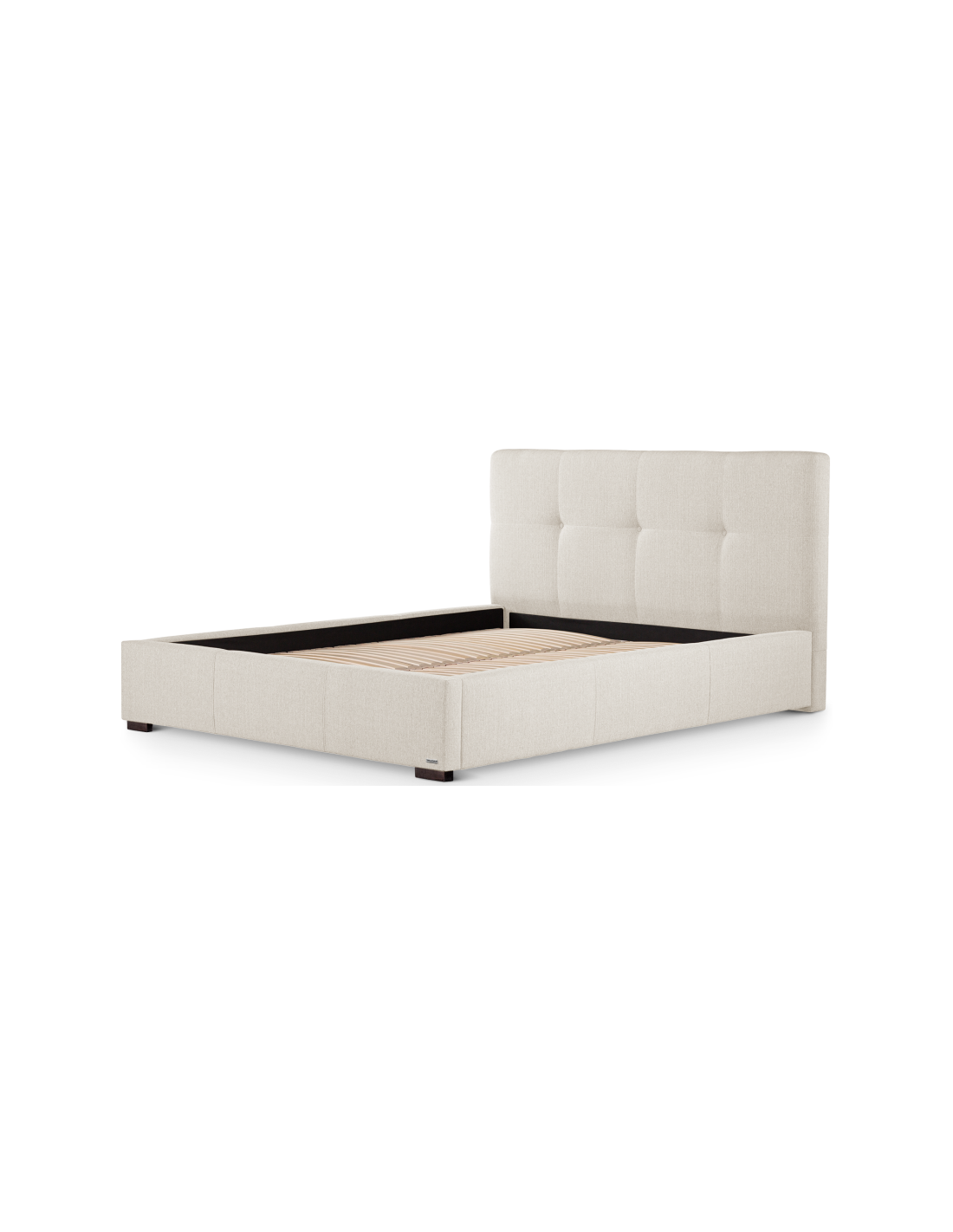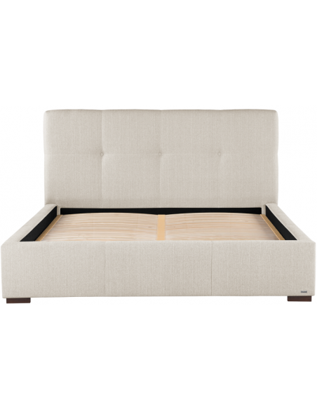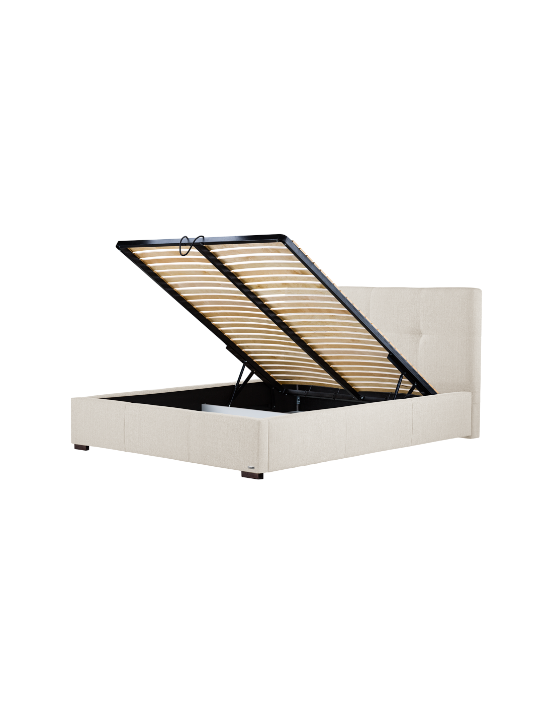 Sengeramme med sengegavl og opbevaring, fremstillet i creme polyester. Sengen måler 198 x 223 cm i bredde og dybde og 34 / 106 cm i højden. Til sengen passer en madras med målene 180 x 200 cm, eller 2 stk. 90 x 200 cm. Denne model har opbevaring under lamelbund.