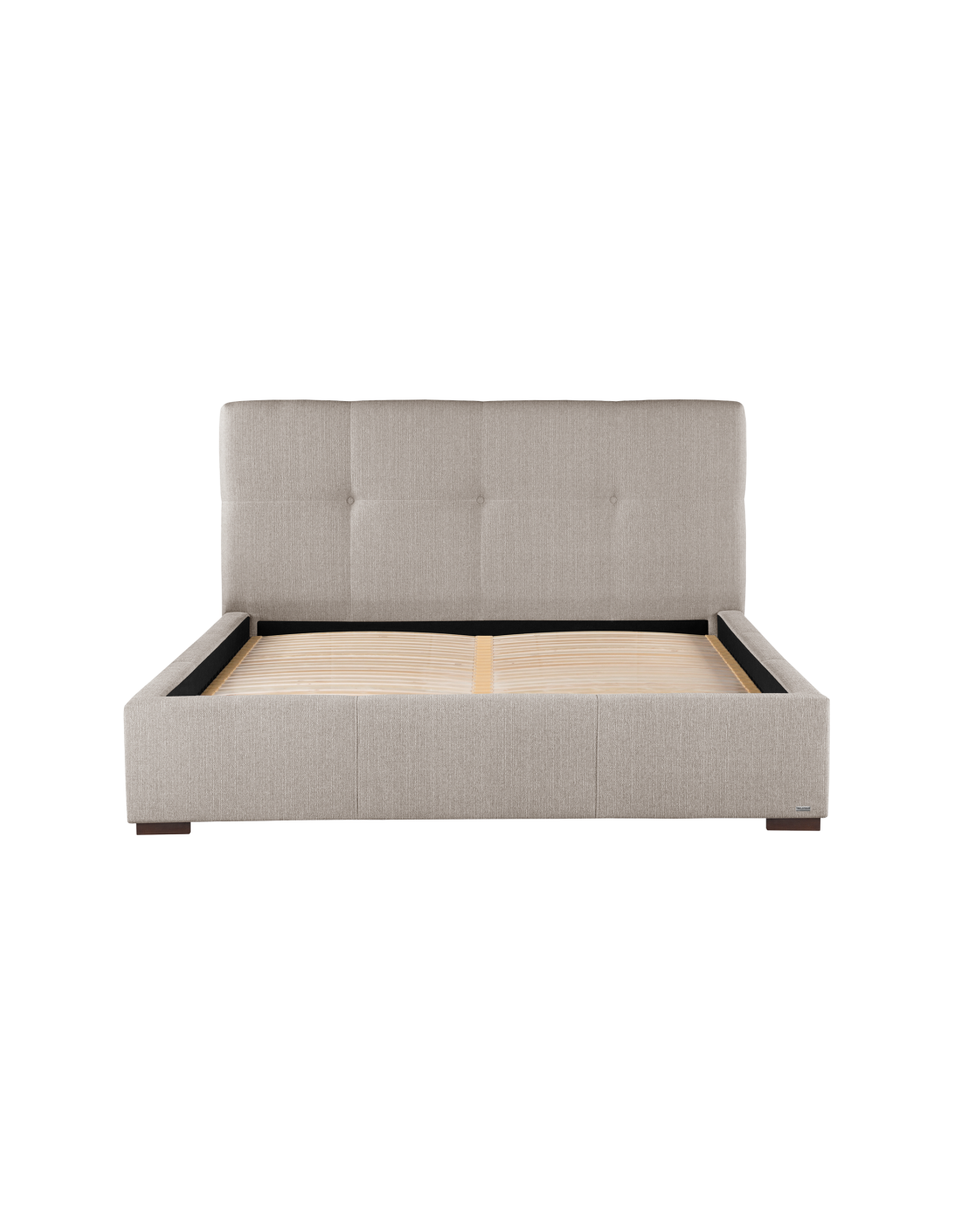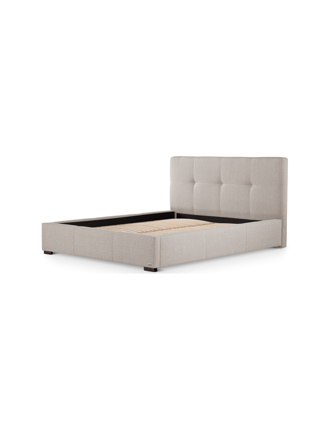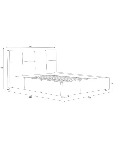 Sengeramme med sengegavl, fremstillet i beige polyester. Sengen måler 198 x 223 cm i bredde og dybde og 34 / 106 cm i højden. Til sengen passer en madras med målene 180 x 200 cm, eller 2 stk. 90 x 200 cm. Denne model har fast lamelbund.