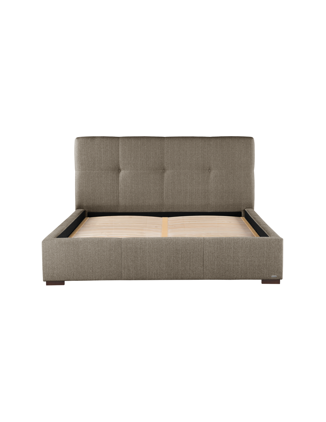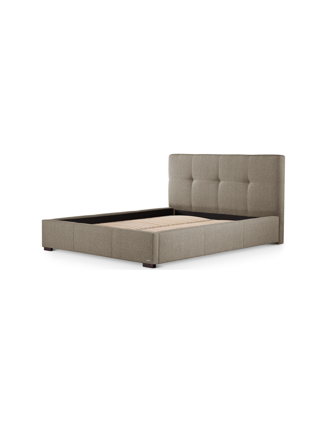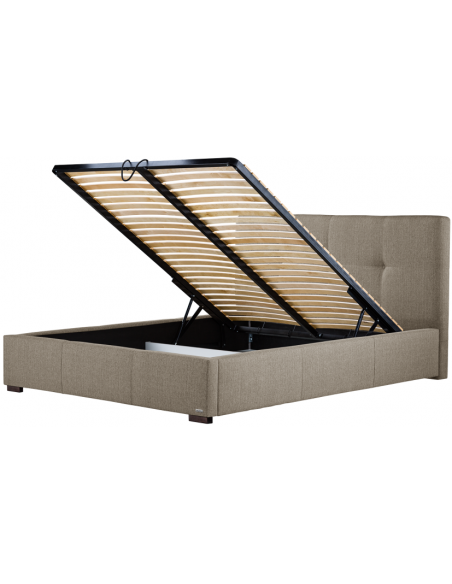 Sengeramme med sengegavl og opbevaring, fremstillet i brun polyester. Sengen måler 198 x 223 cm i bredde og dybde og 34 / 106 cm i højden. Til sengen passer en madras med målene 180 x 200 cm, eller 2 stk. 90 x 200 cm. Denne model har opbevaring under lamelbund.