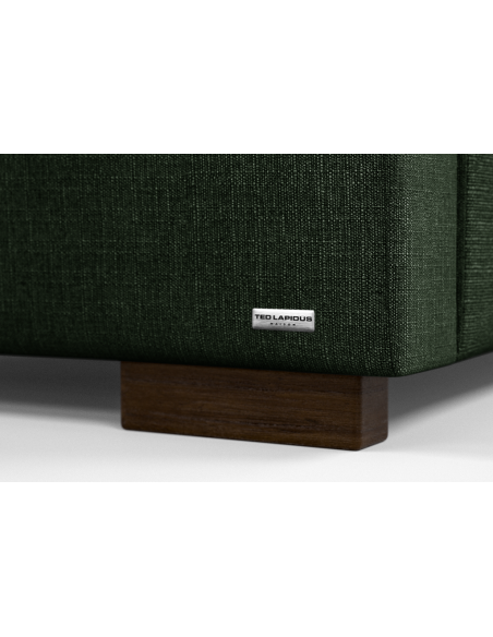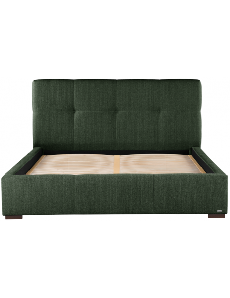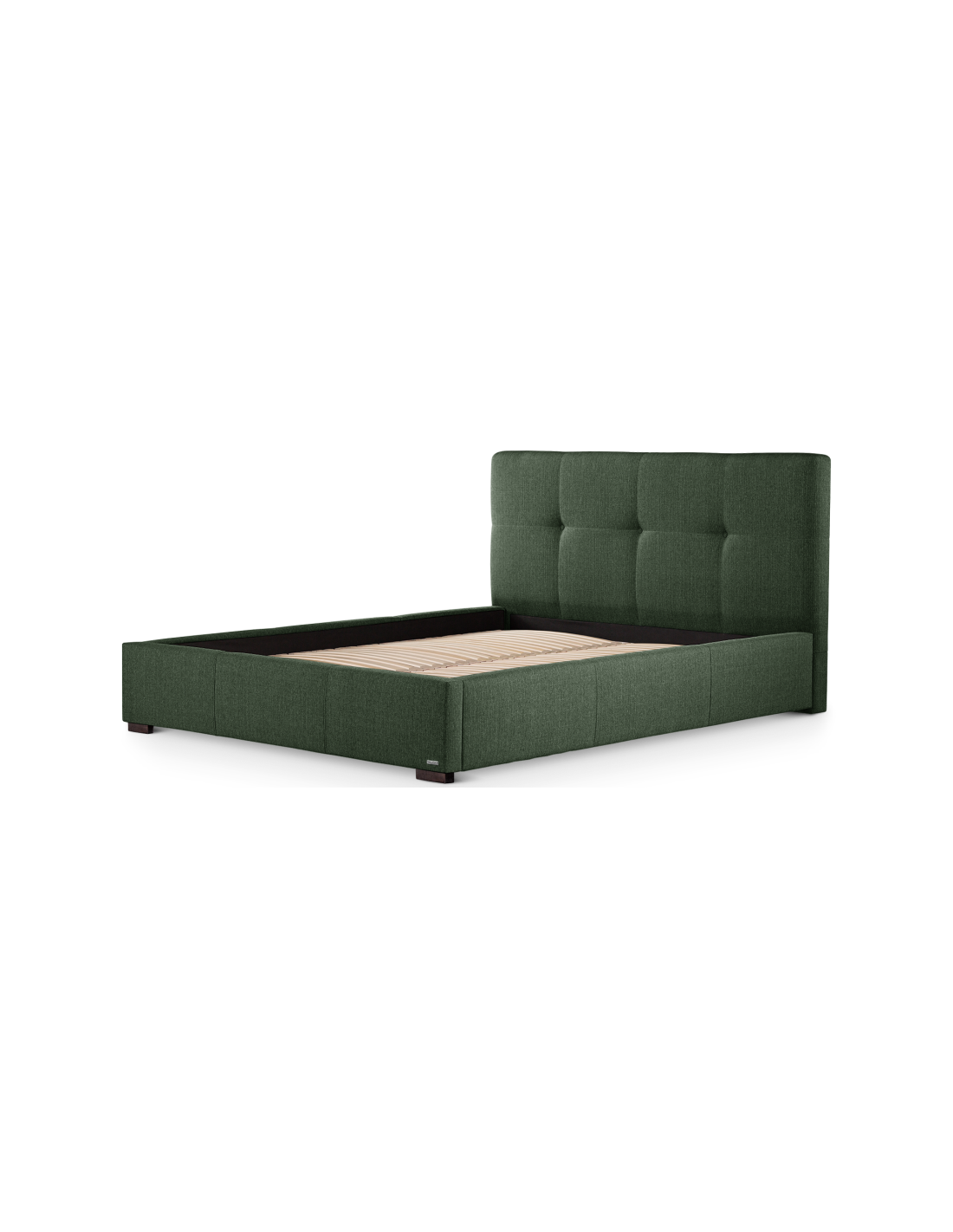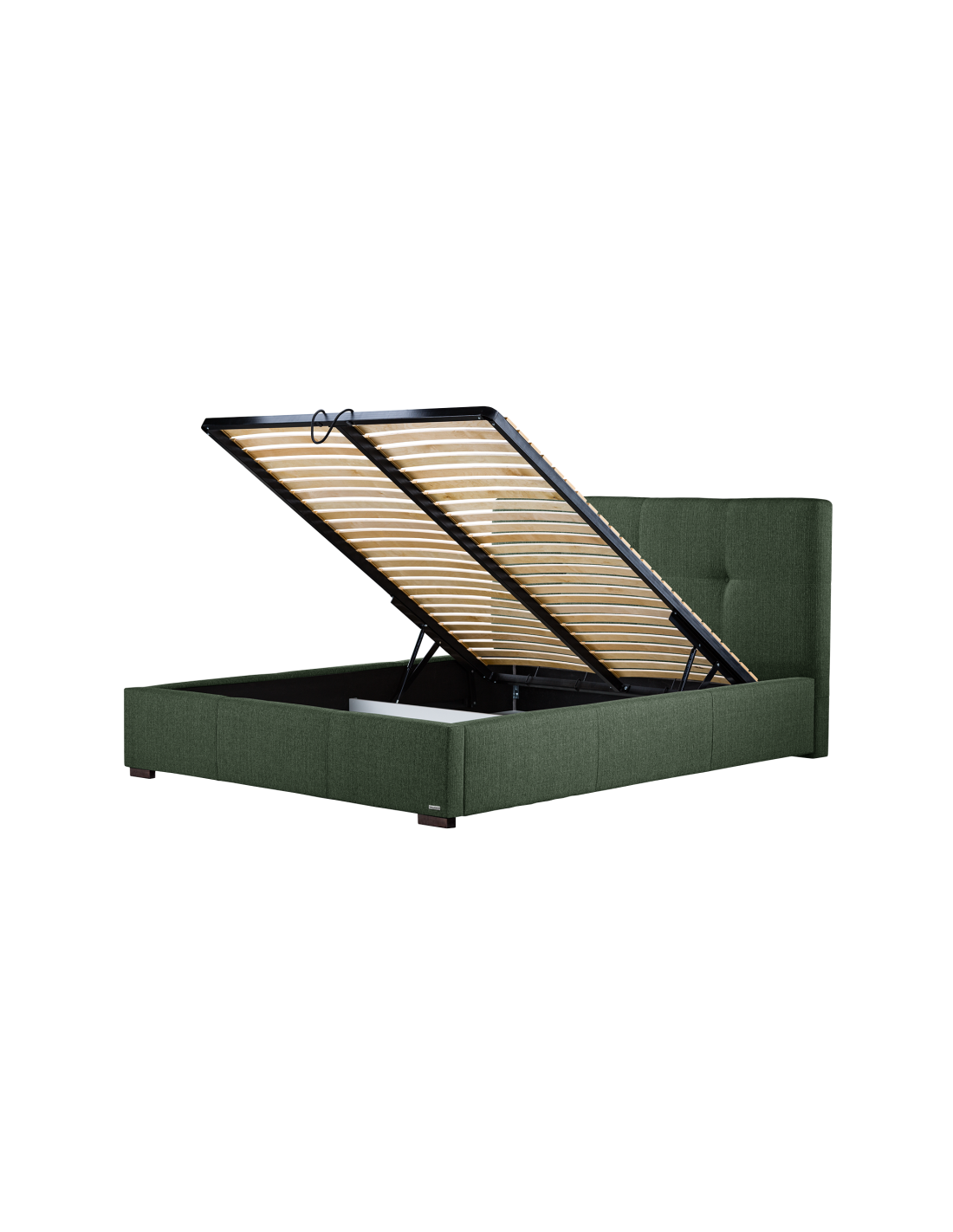 Sengeramme med sengegavl og opbevaring, fremstillet i grøn polyester. Sengen måler 198 x 223 cm i bredde og dybde og 34 / 106 cm i højden. Til sengen passer en madras med målene 180 x 200 cm, eller 2 stk. 90 x 200 cm. Denne model har opbevaring under lamelbund.