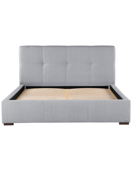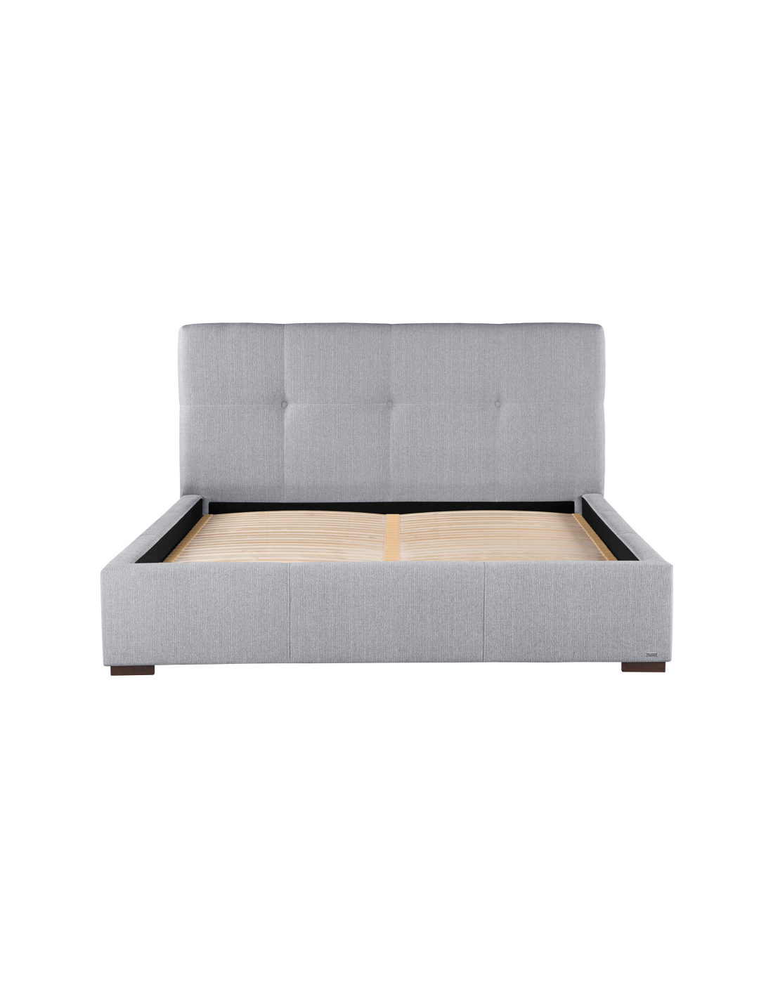 Sengeramme med sengegavl, fremstillet i lysegrå polyester. Sengen måler 198 x 223 cm i bredde og dybde og 34 / 106 cm i højden. Til sengen passer en madras med målene 180 x 200 cm, eller 2 stk. 90 x 200 cm. Denne model har fast lamelbund.