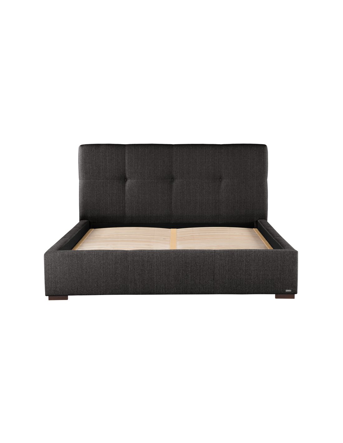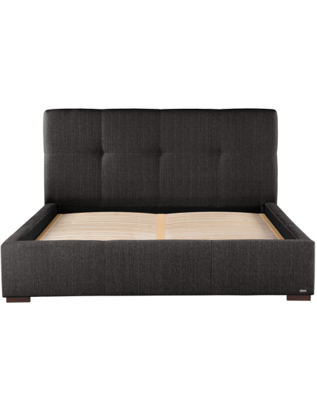 Sengeramme med sengegavl, fremstillet i mørkegrå polyester. Sengen måler 198 x 223 cm i bredde og dybde og 34 / 106 cm i højden. Til sengen passer en madras med målene 180 x 200 cm, eller 2 stk. 90 x 200 cm. Denne model har fast lamelbund.