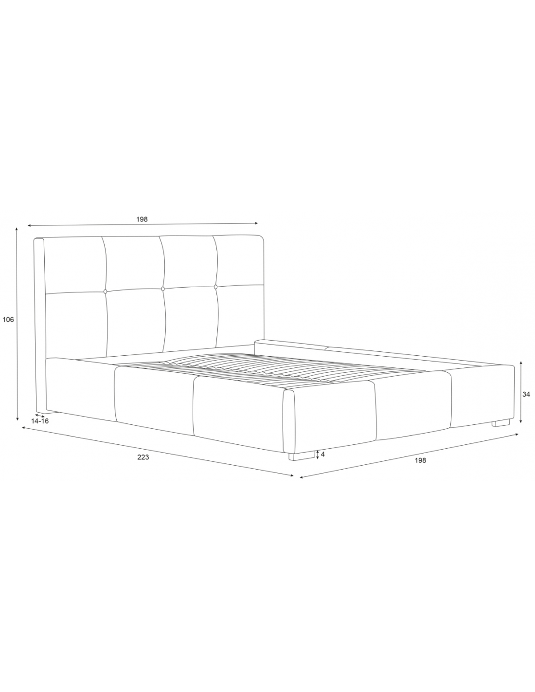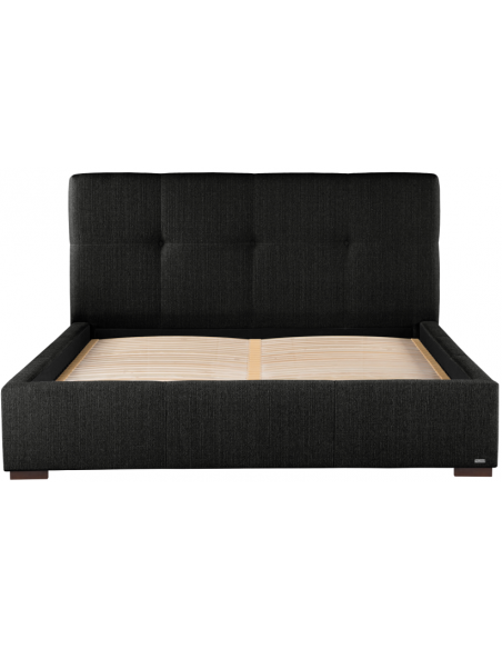 Sengeramme med sengegavl, fremstillet i sort polyester. Sengen måler 198 x 223 cm i bredde og dybde og 34 / 106 cm i højden. Til sengen passer en madras med målene 180 x 200 cm, eller 2 stk. 90 x 200 cm. Denne model har fast lamelbund.