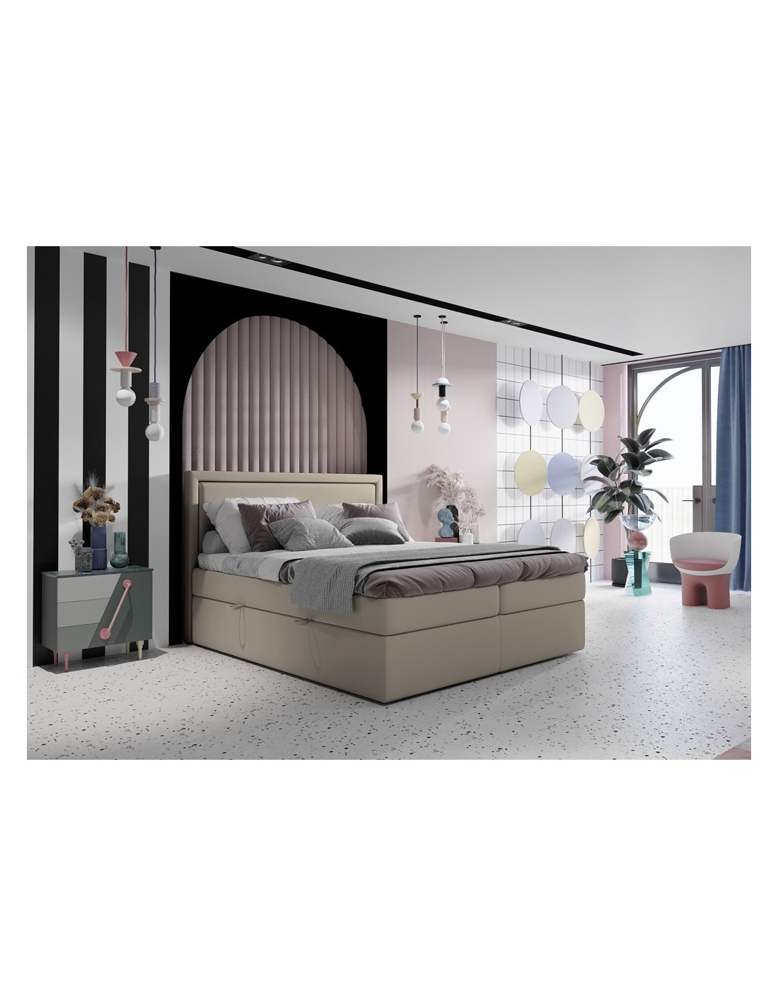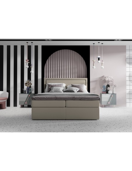 Kontinentalseng med opbevaring og sengegavl, fremstillet i mørk beige velour. Sengen måler 180 x 200 / 211 cm i bredde og dybde og 64 / 118 cm i højden. Madrasserne er med 7 komfortzoner for optimal komfort.