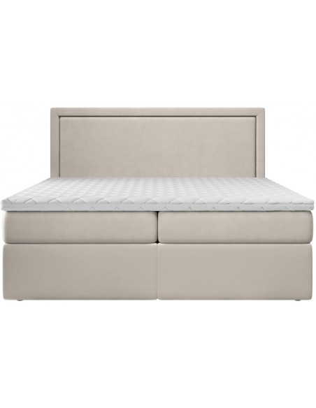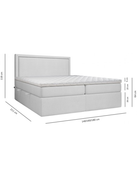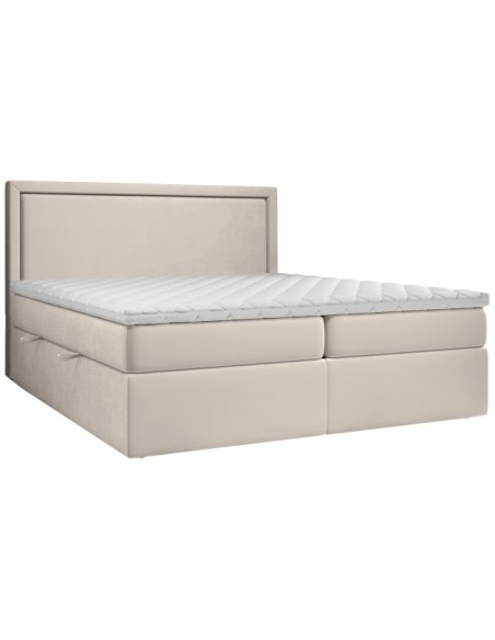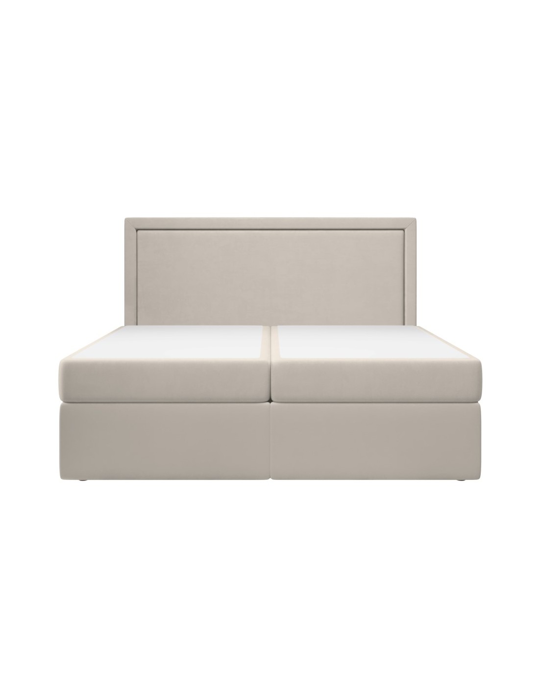 Kontinentalseng med opbevaring og sengegavl, fremstillet i lys beige velour. Sengen måler 180 x 200 / 211 cm i bredde og dybde og 64 / 118 cm i højden. Madrasserne er med 7 komfortzoner for optimal komfort.