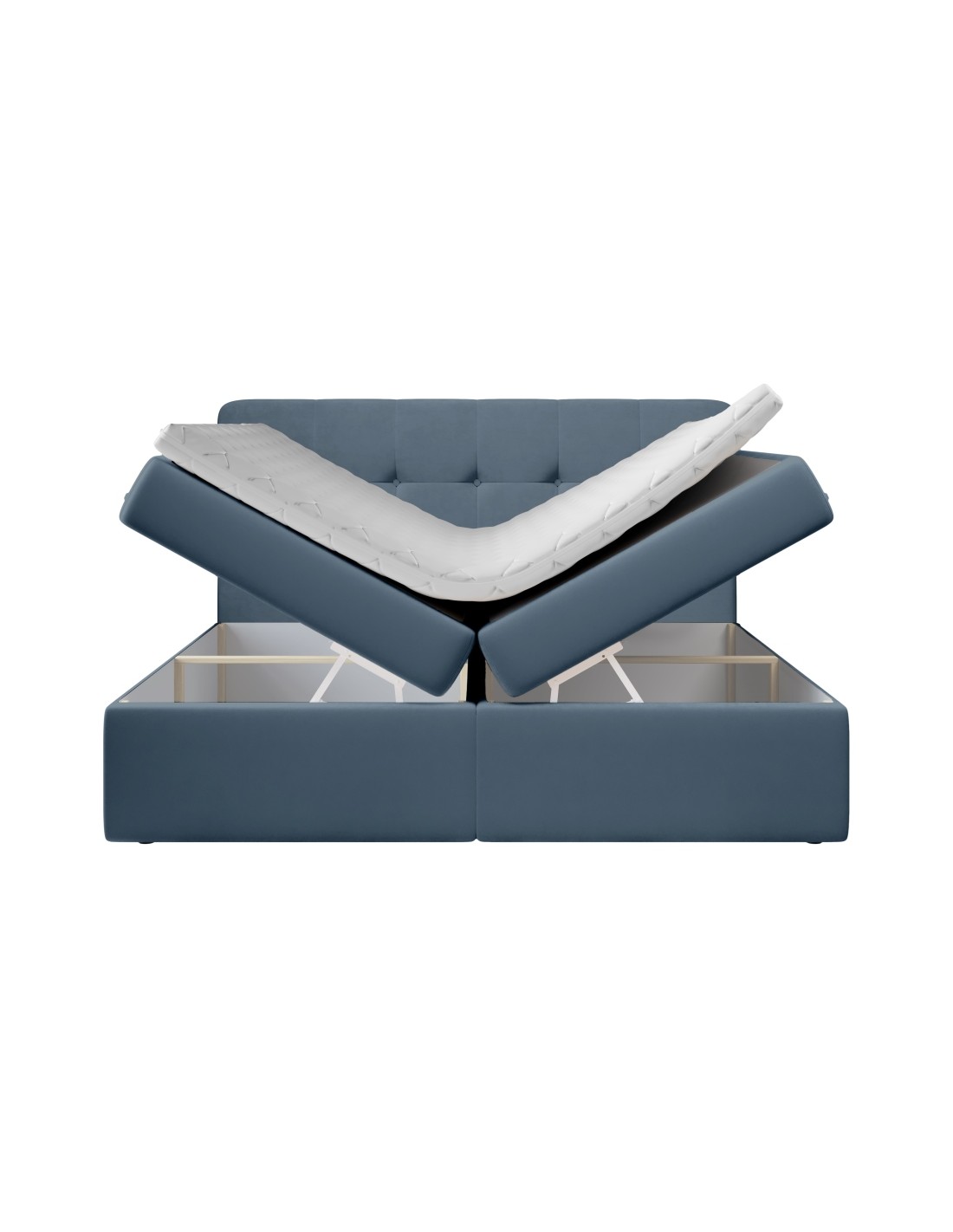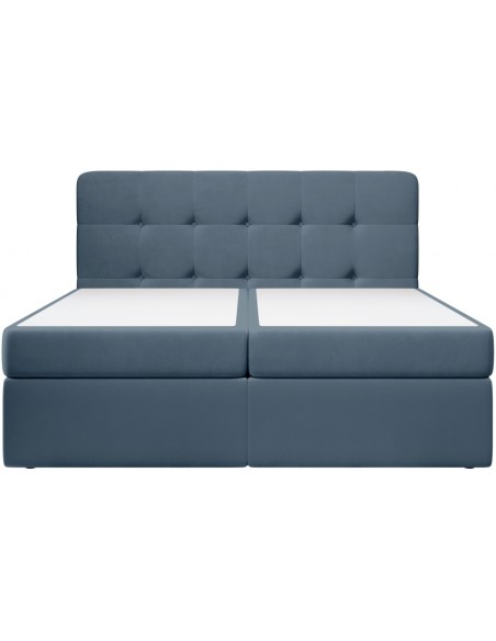 Kontinentalseng med opbevaring og sengegavl, fremstillet i blå velour. Sengen måler 180 x 200 / 211 cm i bredde og dybde og 64 / 118 cm i højden. Madrasserne er med 7 komfortzoner for optimal komfort.