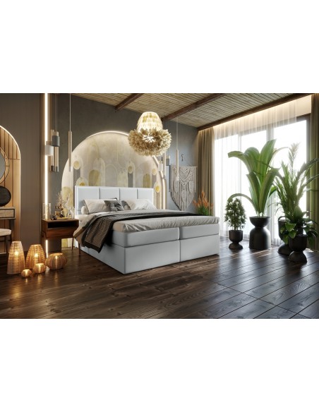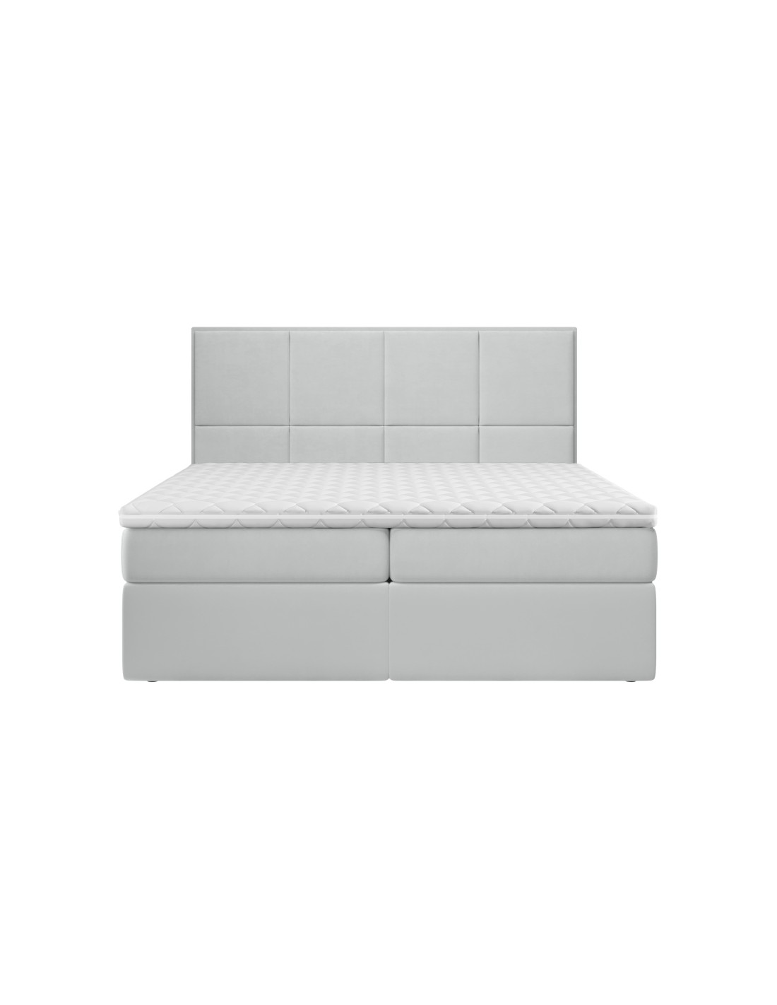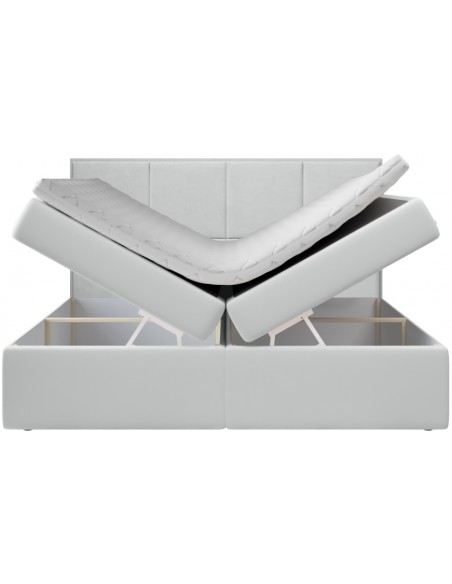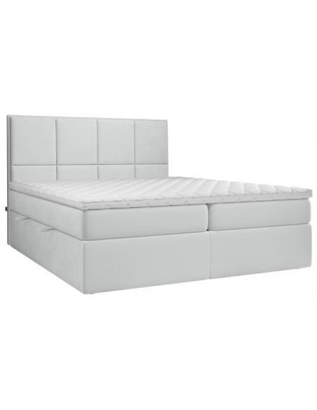 Kontinentalseng med opbevaring og sengegavl, fremstillet i lysegrå velour. Sengen måler 180 x 200 / 211 cm i bredde og dybde og 64 / 118 cm i højden. Madrasserne er med 7 komfortzoner for optimal komfort.