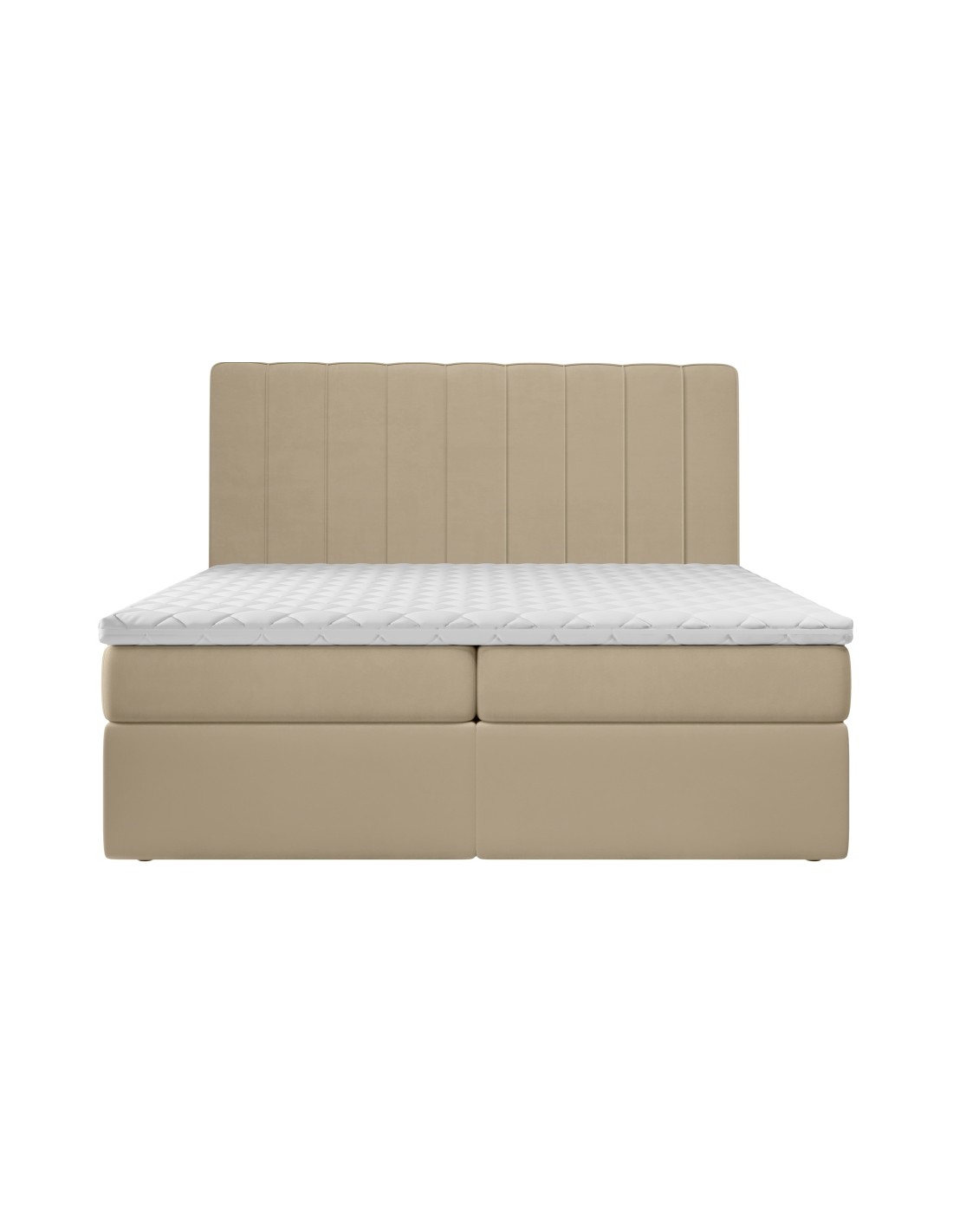 Kontinentalseng med opbevaring og sengegavl, fremstillet i guldbeige velour. Sengen måler 180 x 200 / 211 cm i bredde og dybde og 64 / 118 cm i højden. Madrasserne er med 7 komfortzoner for optimal komfort.