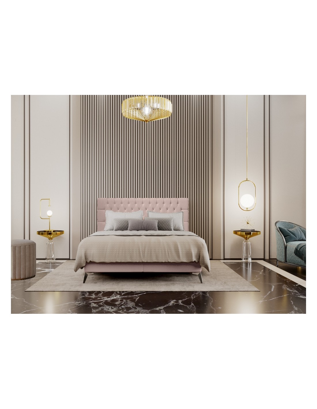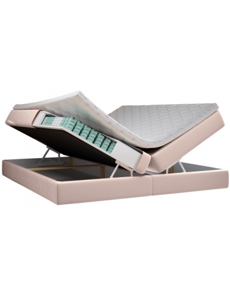 Kontinentalseng med opbevaring og sengegavl, fremstillet i pastelpink velour. Sengen måler 180 x 200 / 211 cm i bredde og dybde og 55 / 120 cm i højden. Madrasserne er med 7 komfortzoner for optimal komfort.