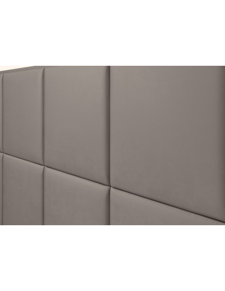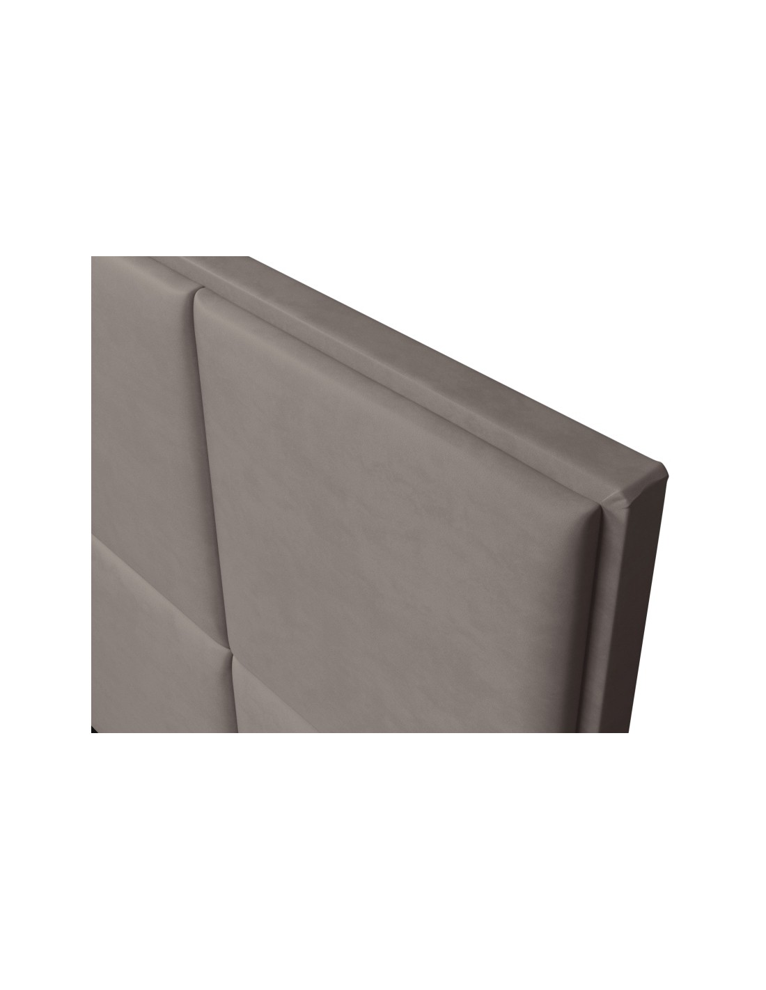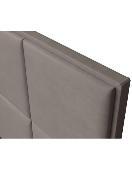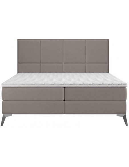 Kontinentalseng med opbevaring og sengegavl, fremstillet i mørk beige velour. Sengen måler 180 x 200 / 211 cm i bredde og dybde og 55 / 123 cm i højden. Madrasserne er med 7 komfortzoner for optimal komfort.