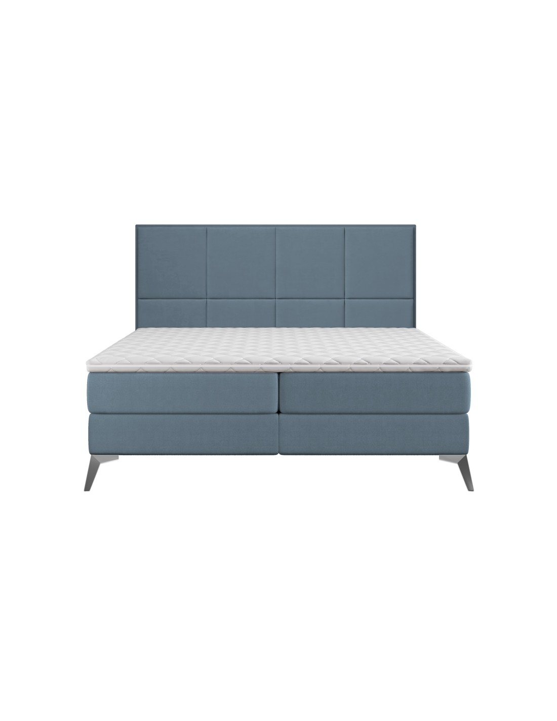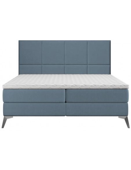 Kontinentalseng med opbevaring og sengegavl, fremstillet i blågrå velour. Sengen måler 180 x 200 / 211 cm i bredde og dybde og 55 / 123 cm i højden. Madrasserne er med 7 komfortzoner for optimal komfort.