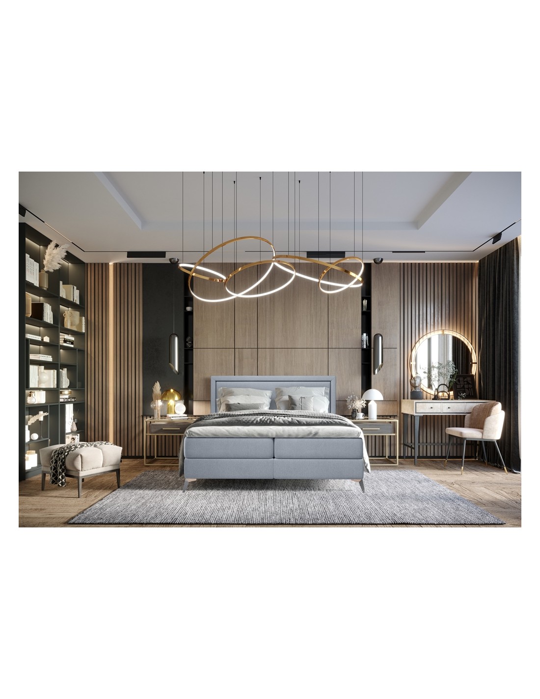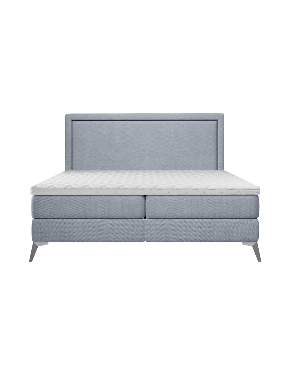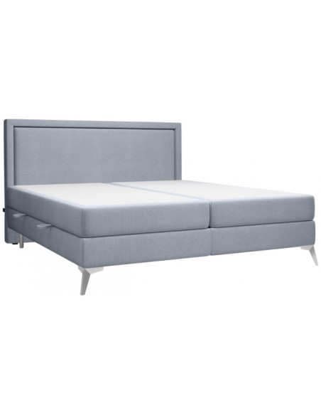 Kontinentalseng med opbevaring og sengegavl, fremstillet i blågrå polyester. Sengen måler 180 x 200 / 211 cm i bredde og dybde og 55 / 118 cm i højden. Madrasserne er med 7 komfortzoner for optimal komfort.