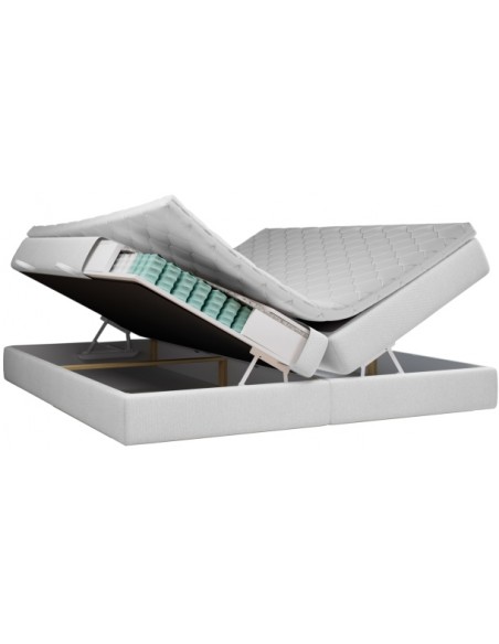 Kontinentalseng med opbevaring og sengegavl, fremstillet i lysegrå polyester. Sengen måler 180 x 200 / 211 cm i bredde og dybde og 55 / 118 cm i højden. Madrasserne er med 7 komfortzoner for optimal komfort.