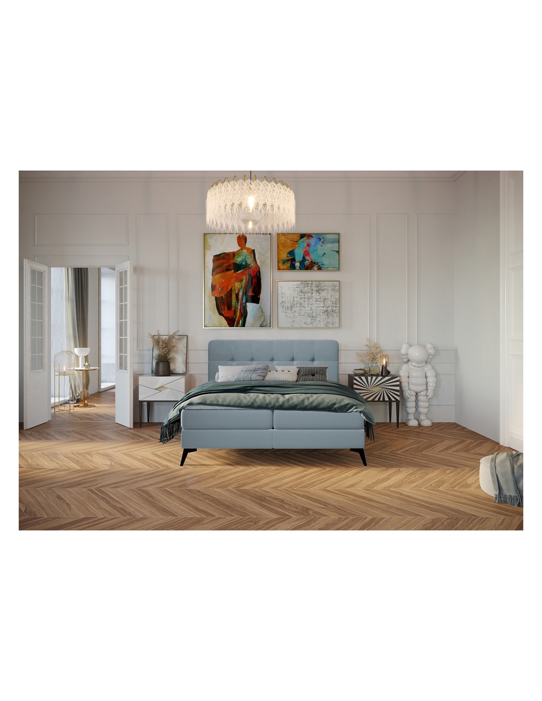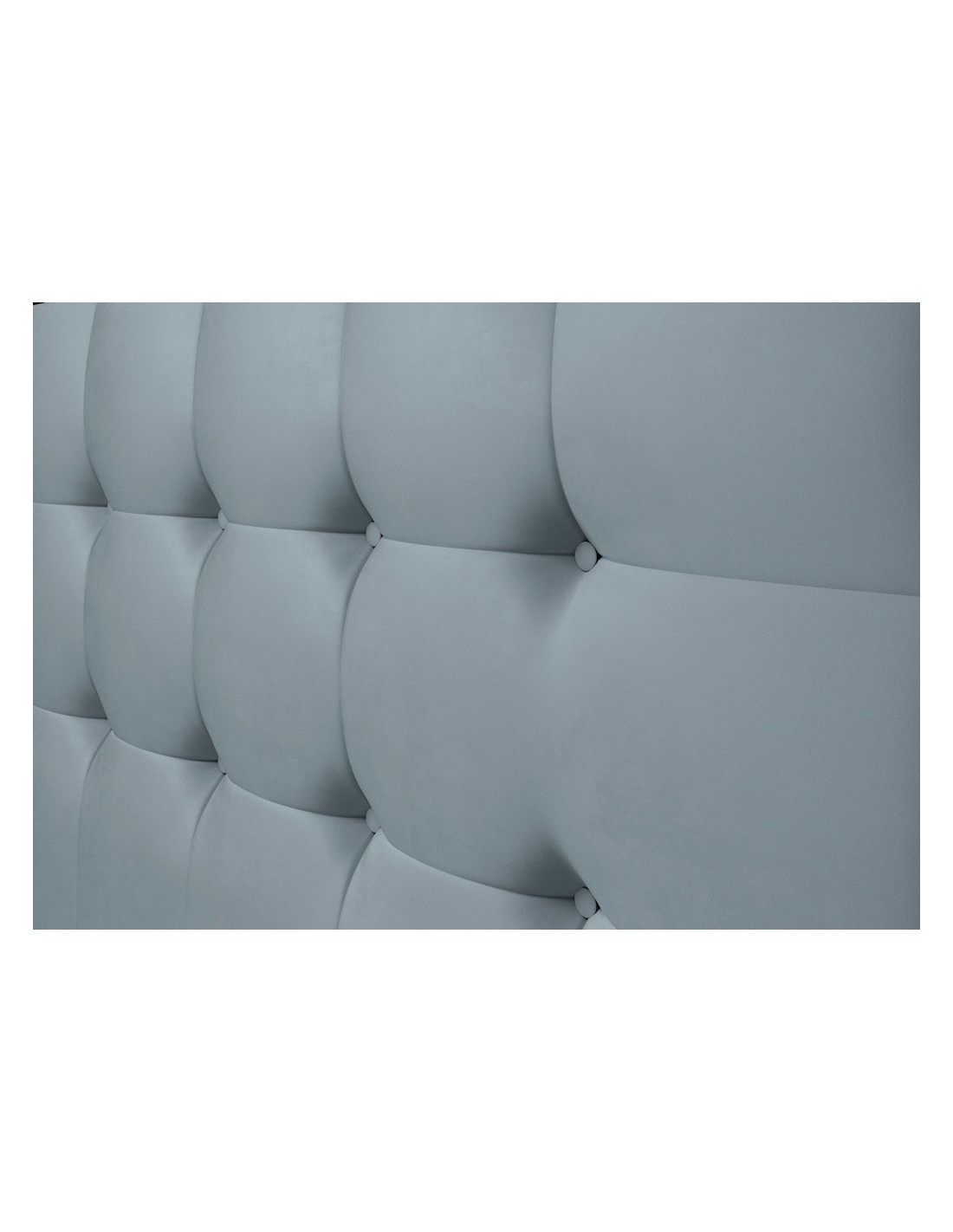 Kontinentalseng med opbevaring og sengegavl, fremstillet i blågrå velour. Sengen måler 180 x 200 / 211 cm i bredde og dybde og 55 / 118 cm i højden. Madrasserne er med 7 komfortzoner for optimal komfort.