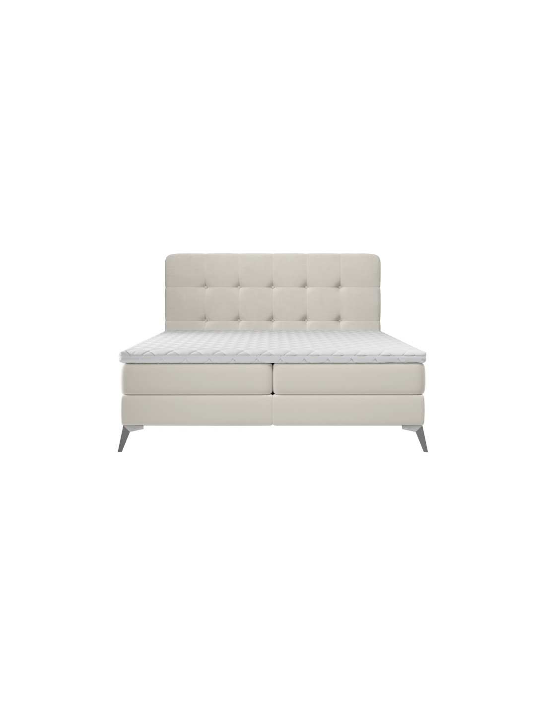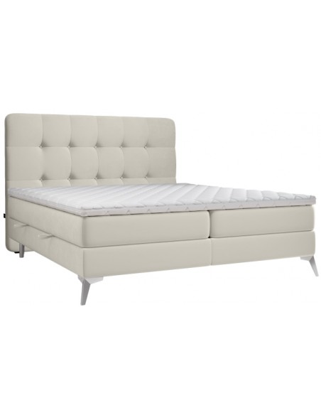 Kontinentalseng med opbevaring og sengegavl, fremstillet i lys beige velour. Sengen måler 180 x 200 / 211 cm i bredde og dybde og 55 / 118 cm i højden. Madrasserne er med 7 komfortzoner for optimal komfort.