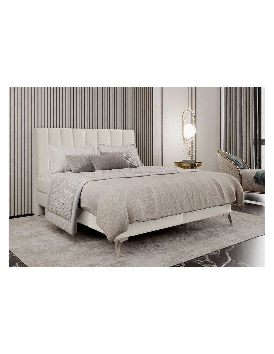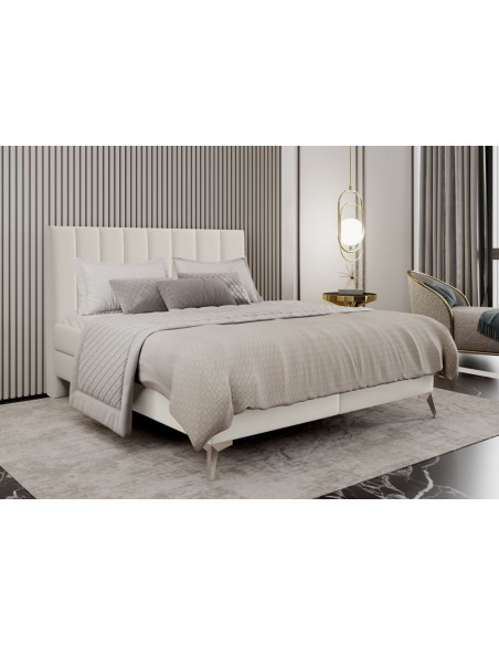 Kontinentalseng med opbevaring og sengegavl, fremstillet i cremehvid velour. Sengen måler 180 x 200 / 211 cm i bredde og dybde og 55 / 118 cm i højden. Madrasserne er med 7 komfortzoner for optimal komfort.