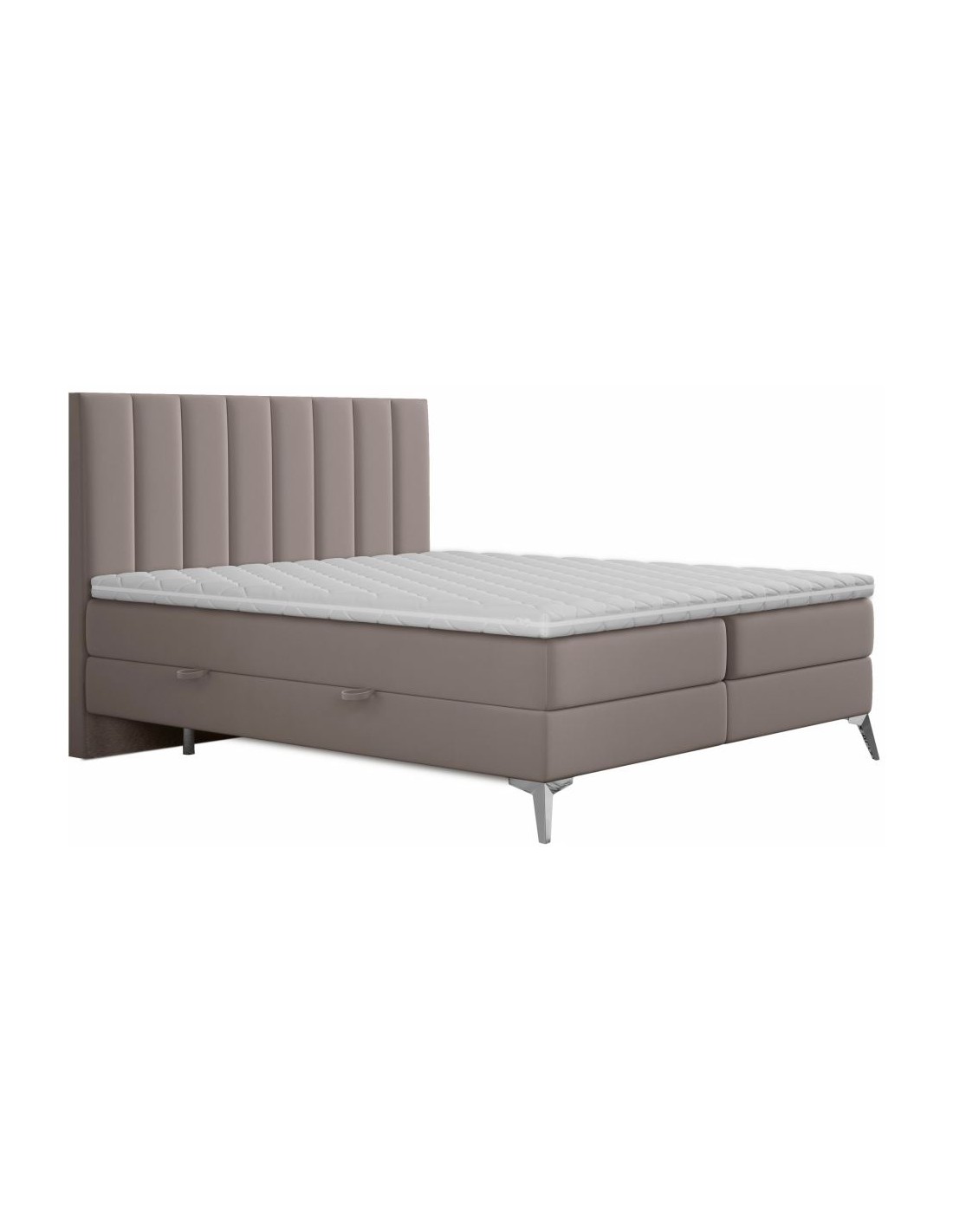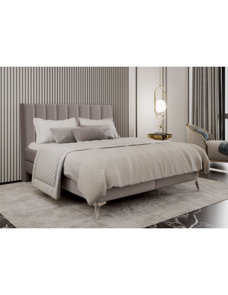Kontinentalseng med opbevaring og sengegavl, fremstillet i mørk beige velour. Sengen måler 180 x 200 / 211 cm i bredde og dybde og 55 / 118 cm i højden. Madrasserne er med 7 komfortzoner for optimal komfort.