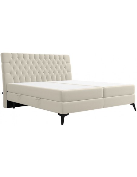 Kontinentalseng med opbevaring og sengegavl, fremstillet i lys beige velour. Sengen måler 180 x 200 / 211 cm i bredde og dybde og 55 / 118 cm i højden. Madrasserne er med 7 komfortzoner for optimal komfort.