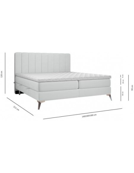 Kontinentalseng med opbevaring og sengegavl, fremstillet i lysegrå velour. Sengen måler 180 x 200 / 211 cm i bredde og dybde og 55 / 120 cm i højden. Madrasserne er med 7 komfortzoner for optimal komfort.