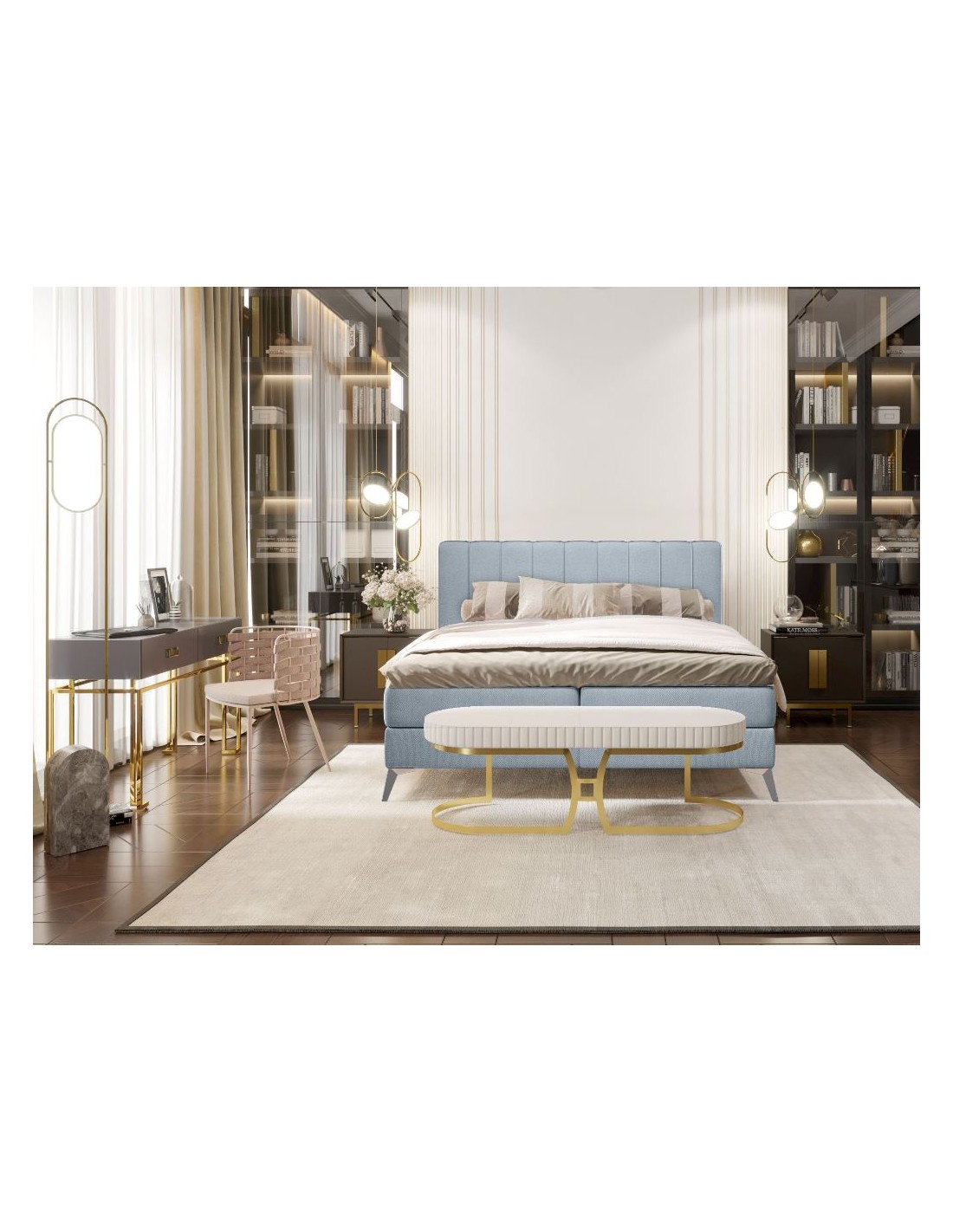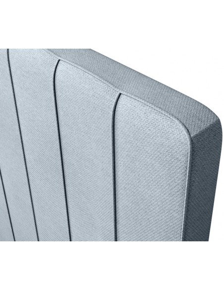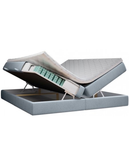 Kontinentalseng med opbevaring og sengegavl, fremstillet i blågrå polyester. Sengen måler 180 x 200 / 211 cm i bredde og dybde og 55 / 120 cm i højden. Madrasserne er med 7 komfortzoner for optimal komfort.