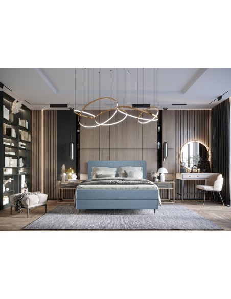 Kontinentalseng med sengegavl, fremstillet i blågrå velour. Sengen måler 180 x 200 / 211 cm i bredde og dybde og 55 / 120 cm i højden. Madrasserne er med 7 komfortzoner for optimal komfort.